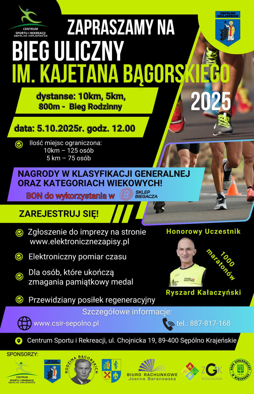 Nawet 200 biegaczy na starcie spodziewają się organizatorzy jutrzejszego (05.10) biegu ulicznego im. Kajetana Bągorskiego w Sępólnie Krajeńskim. Będzie to jubileuszowa, bo X edycja tej imprezy, właśnie dlatego przygotowano z tej okazji sporo niespodzianek. Bieg główny to tradycyjnie 10 kilometrów ulicami Sępólna, ale po kilku latach przerwy wraca także bieg na dystansie 5 kilometrów. Oprócz tego po raz pierwszy zorganizowany zostanie także bieg rodzinny na bieżni stadionu na dystansie 800 metrów, a na godzinę przed startem ruszy tak zwana strefa kibica. Zapisy elektroniczne na bieg już się zakończyły, ale w miarę wolnych miejsc będzie można dopełnić formalności także tuż przed startem. Wszystko ruszy na stadionie miejskim w Sępólnie o godzinie 11.00.