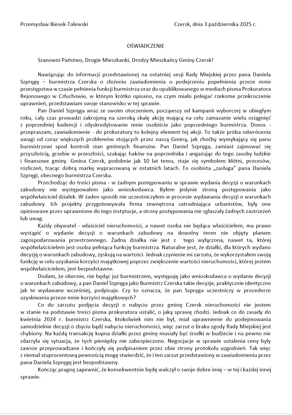 Oświadcza były burmistrz, a obecnie przewodniczący rady miejskiej Przemysław Biesek-Talewski.