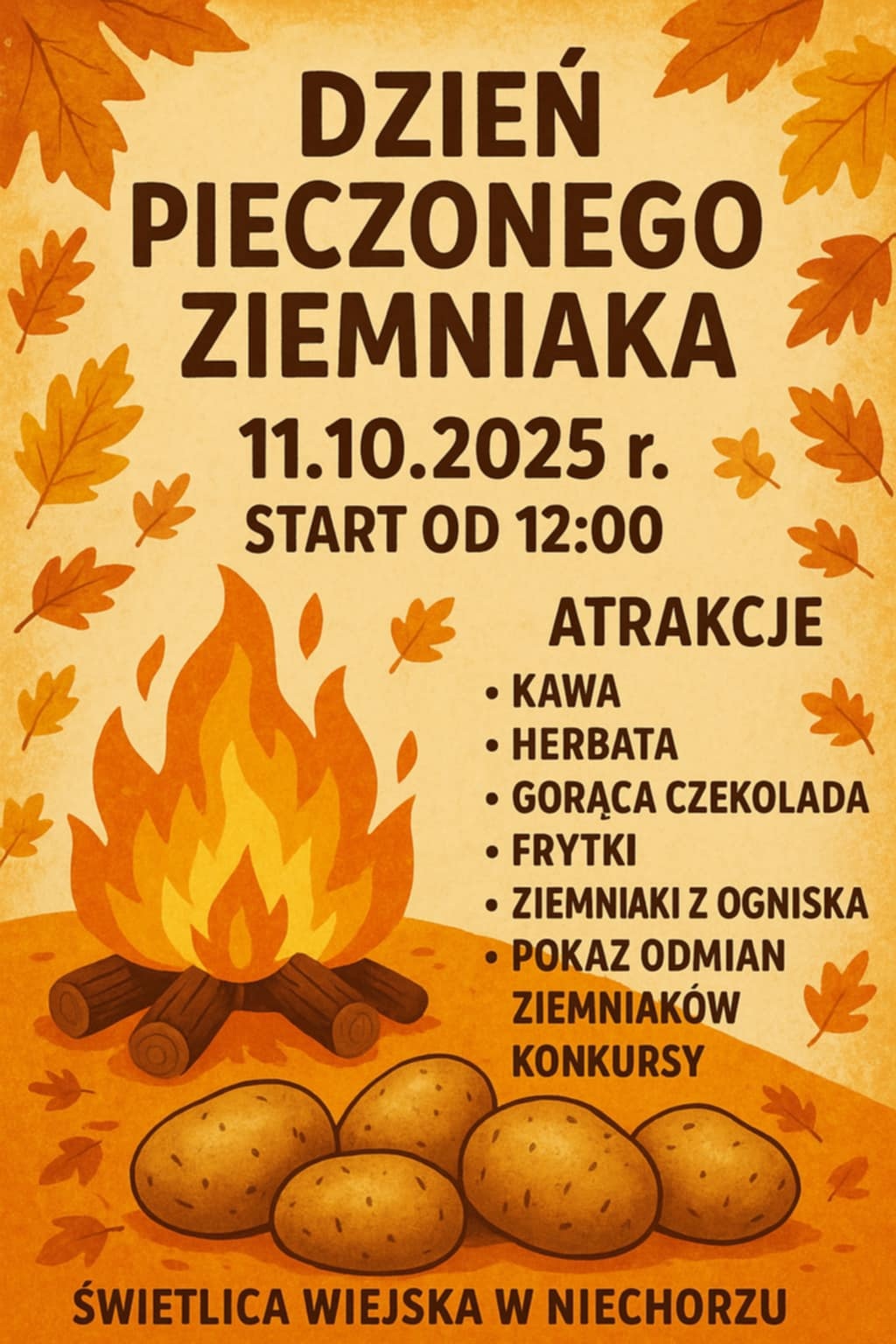 Będą atrakcje dla najmłodszych i tych nieco starszych, wspólne ognisko i król polskich stołów czyli ziemniak. Stowarzyszenie "Wioska z pasją" z Niechorza w gminie Sępólno zaprasza w sobotę na "Dzień pieczonego ziemniaka". Organizatorzy przygotowali też prezentacje najlepszych odmian ziemniaka, ale najważniejsze to pieczone frytki i ziemniaki ze wspólnego ogniska. Wszystko rozpocznie się przy świetlicy wiejskiej w Niechorzu o godzinie 12.00.