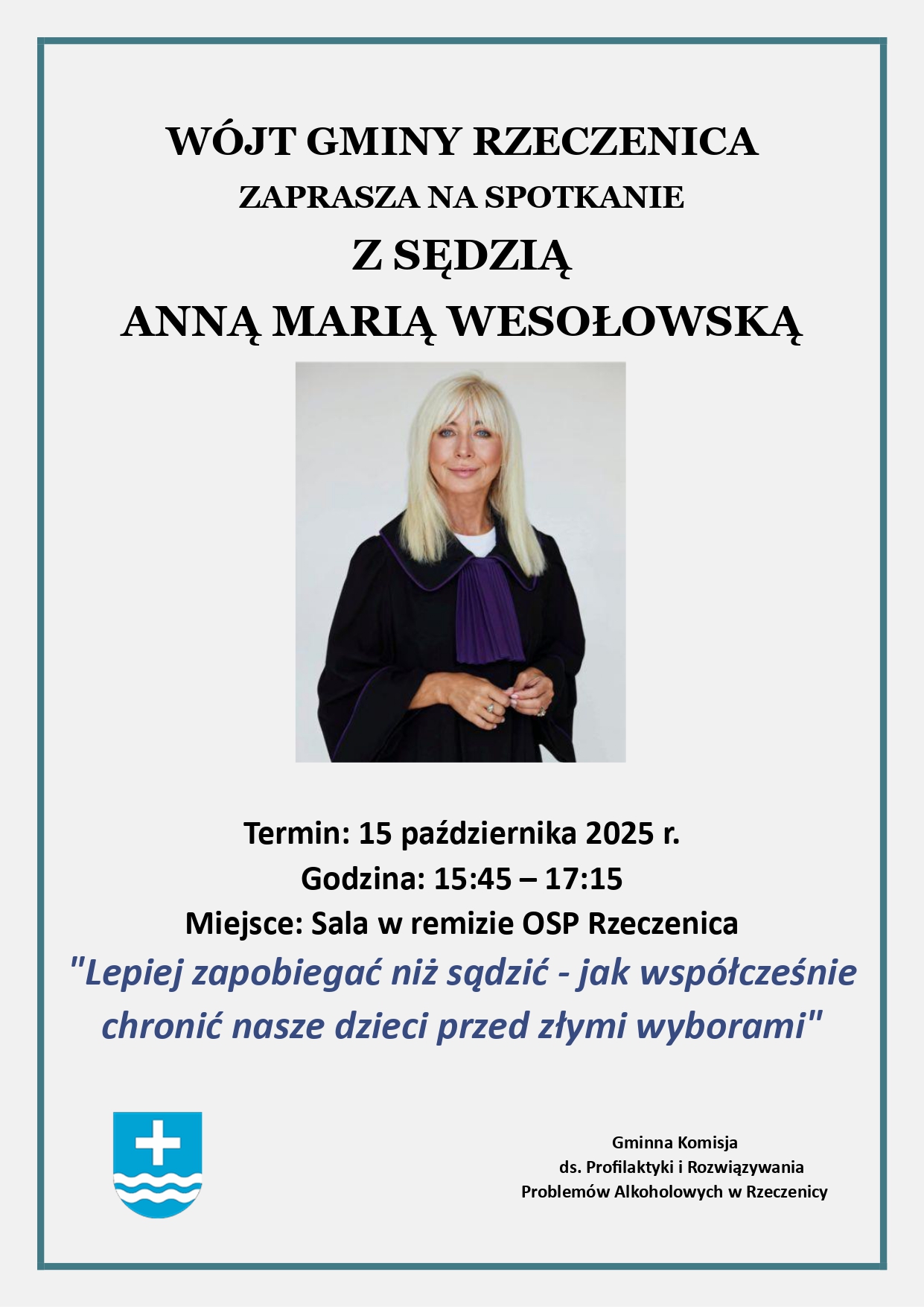 Sędzia w stanie spoczynku, propagatorka wiedzy o prawie i aktorka, znana z serialu paradokumentalnego Anna Maria Wesołowska, odwiedzi dziś (15.10) Rzeczenicę. Przyjedzie na zaproszenie Gminnej Komisji ds. Profilaktyki i Rozwiązywania Problemów Alkoholowych. Spotka się z jej członkami oraz osobami działającymi w Zespole Interdyscyplinarnym.