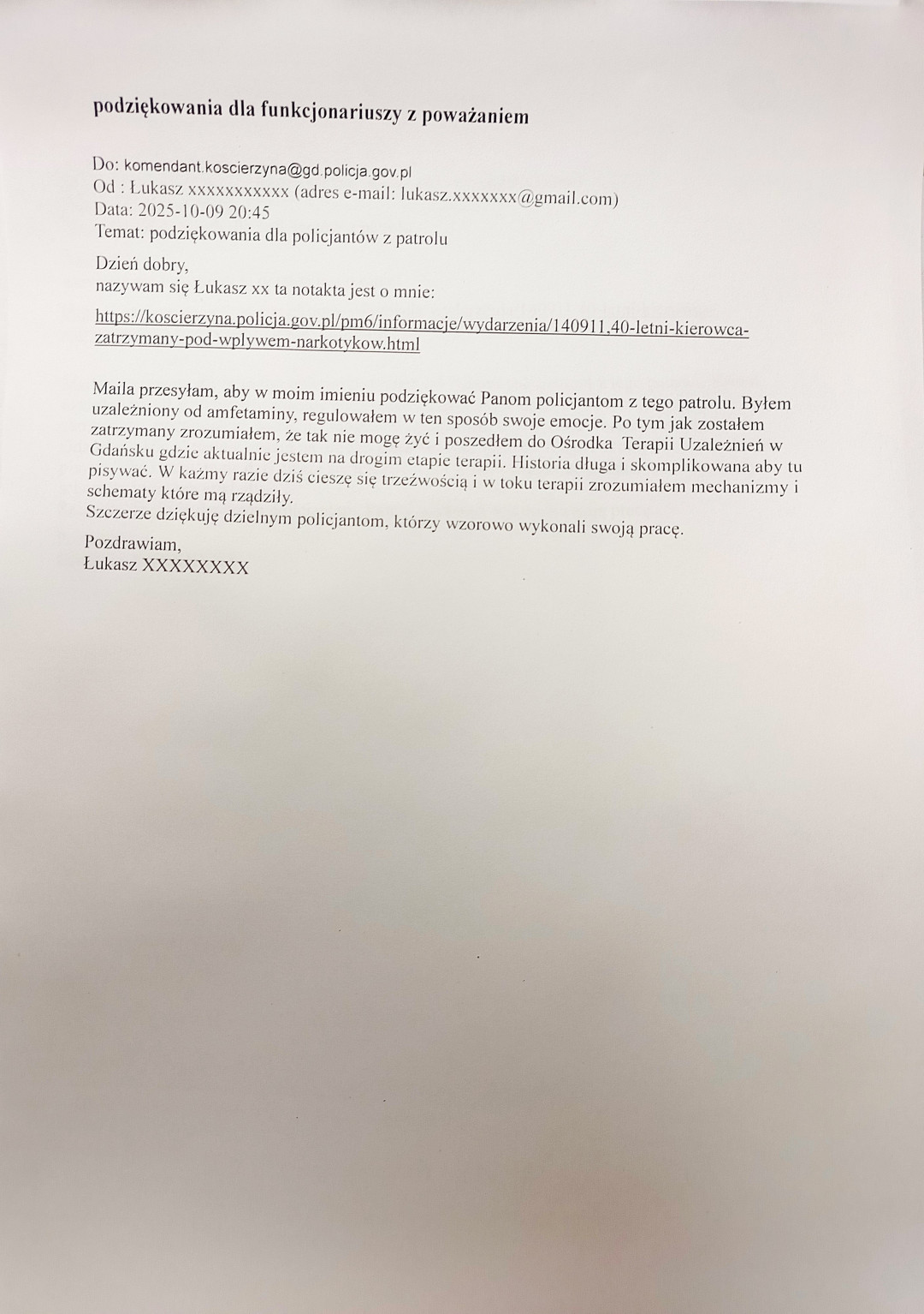 Został zatrzymany przez kościerskich policjantów, gdy kierował autem pod wpływem amfetaminy. Postanowił jednak zmienić swoje życie i skorzystać z terapii. Dziś dziękuje funkcjonariuszom za "empatię i wzorowe wypełnianie obowiązków". Nietypowy mail z podziękowaniami od jednego z kierowców trafił na skrzynkę Komendanta Powiatowego Policji w Kościerzynie. W przesłanym do komendy liście 40 - letni mieszkaniec powiatu kościerskiego informuje, że przez wiele lat był uzależniony od amfetaminy. Pod koniec stycznia został zatrzymany przez patrol drogówki w Dębogórach, w gminie Kościerzyna. Kierował wówczas autem pod wpływem narkotyku: