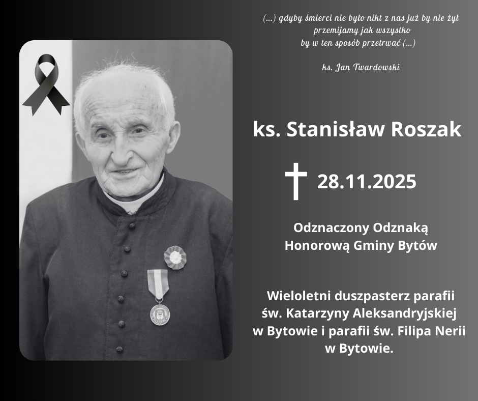 Bytów żegna wieloletniego duszpasterza parafii św. Katarzyny Aleksandryjskiej i parafii św. Filipa Neri. W wieku 91 lat zmarł ks. Stanisław Roszak, odznaczony Odznaką Honorową Gminy Bytów.
