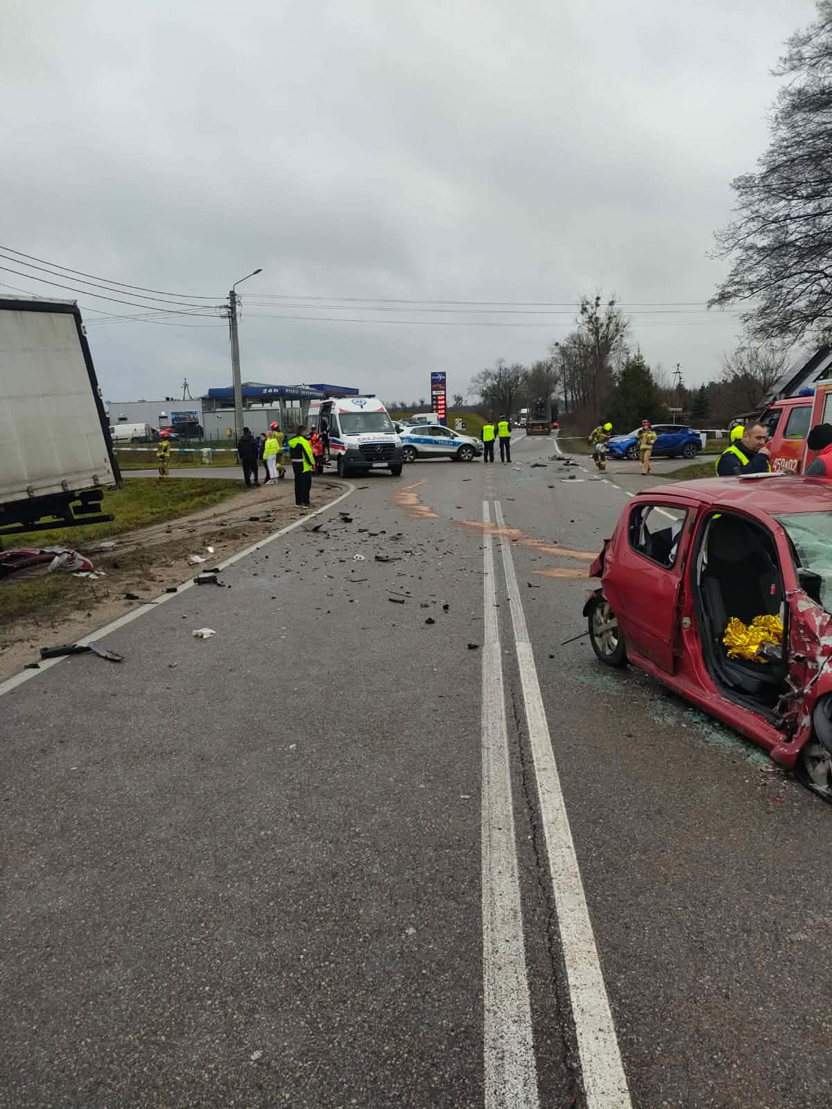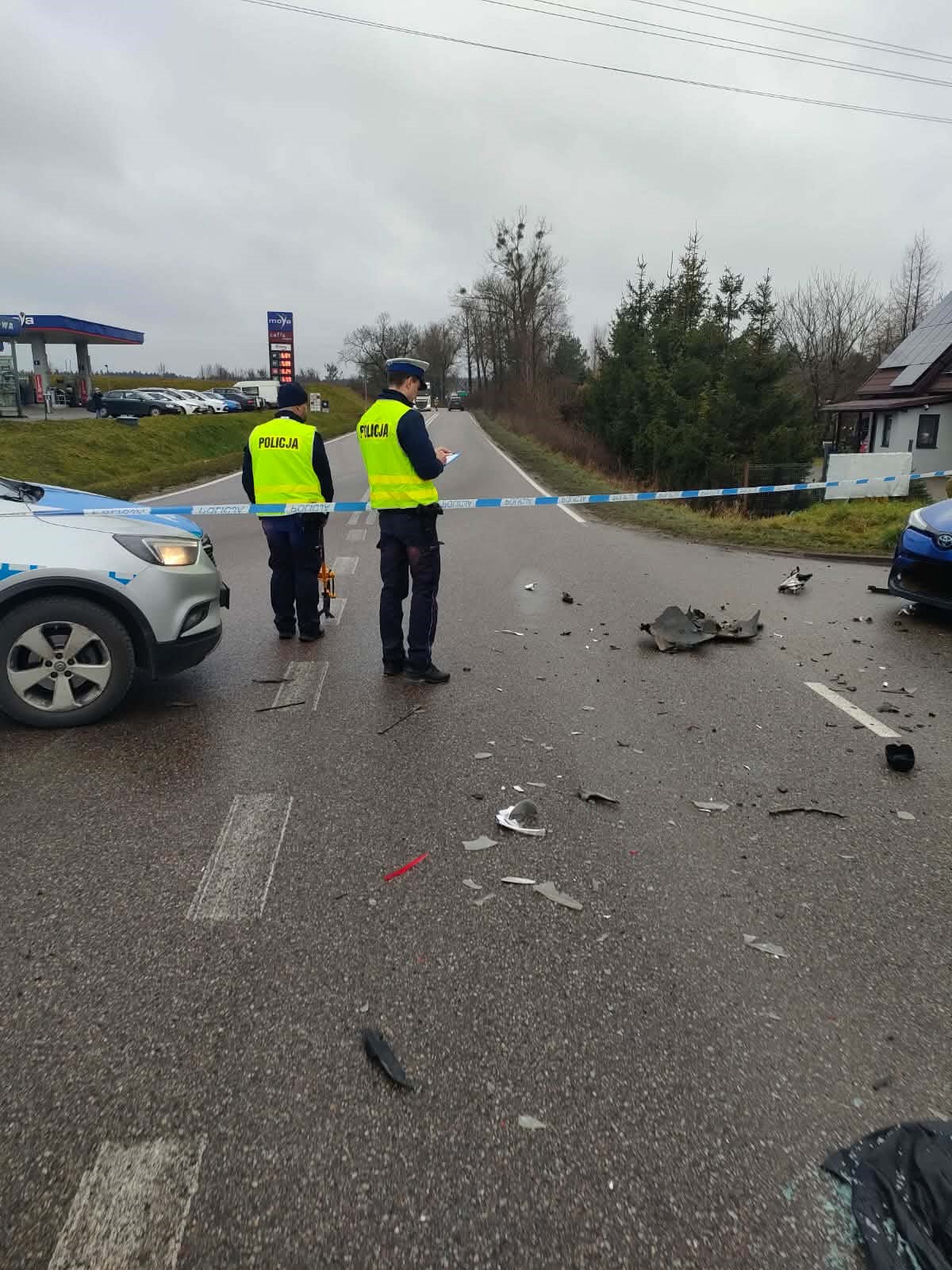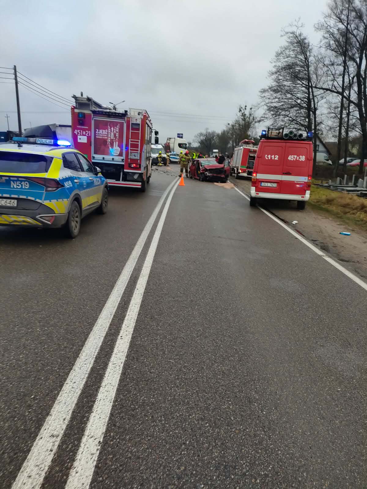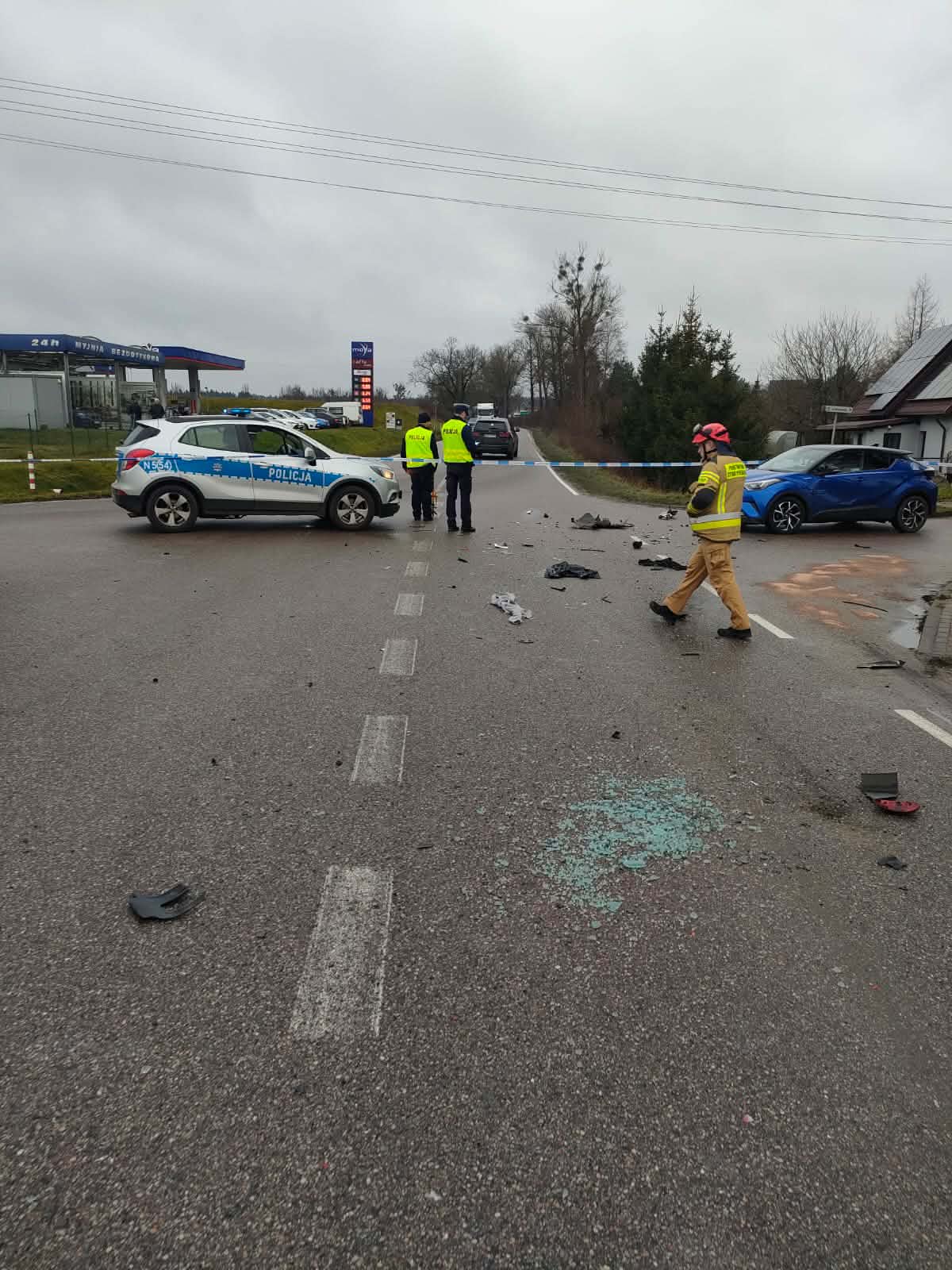 Kierująca zwalniała, by skręcić w lewo, jednak siła uderzenia wepchnęła ją na przeciwległy pas ruchu pod ciężarówkę, którą kierował trzydziestoletni mężczyzna. W wyniku zdarzenia 22-letnia kobieta z obrażeniami nóg trafiła do do szpitala. Zabrało ją Lotnicze Pogotowie Ratunkowe.