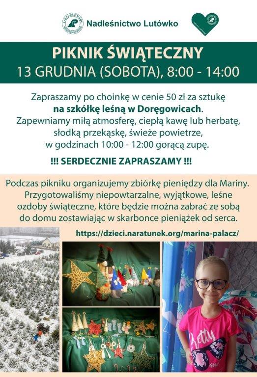 Nadleśnictwo Lutówko zaprasza jutro (13.12) na piknik świąteczny do swojej szkółki w Doręgowicach. Każdy sam będzie mógł sobie wybrać drzewko i zapłacić za nie 50 zł, bez względu na jego wielkość. Pieniądze zebrane podczas akcji zostaną przekazane na leczenie chorej na białaczkę 4-letnią Mariny Palacz z Piaseczna koło Sępólna.