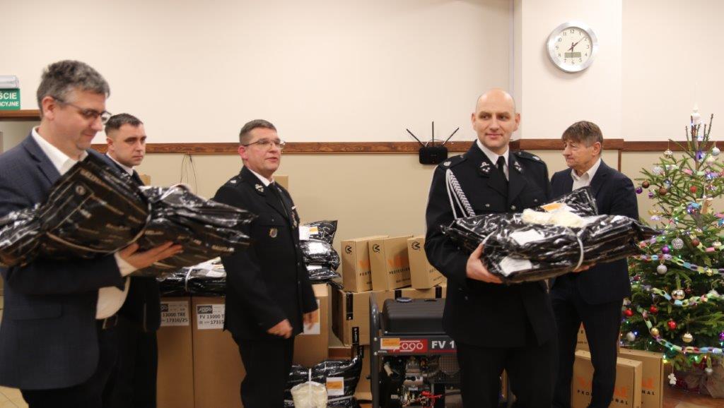 Przede wszystkim dużo zdrowia, spokoju, tyle powrotów co wyjazdów, bo to jest chyba najważniejsze dla strażaka, żeby było jak najmniej tych interwencji, a jak najwięcej ćwiczeń. Takiego pożytku dla ludzi, dla społeczeństwa i dzisiaj to jest namiastka tego sprzętu, który chcemy przekazać. To jest w ramach ochrony ludności. No tak jak tutaj widzimy będą to agregaty prądotwórcze. to są już ubrania bojowe. hełmy pożarnicze i obuwie strażackie.
