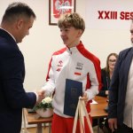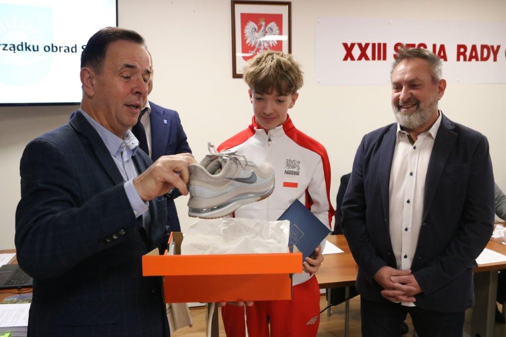 "W tym roku wygrał wszystko, co mógł wygrać w swojej kategorii" - tak przewodniczący Rady Gminy Przechlewo Tomasz Prus uzasadniał uhonorowanie Alexa Majera - lekkoatlety Brdy Przechlewo i ucznia przechlewskiej podstawówki. Wraz z wójtem nagrodzili 13-latka za liczne sukcesy. To m.in. wygranie ogólnopolskiego finału Czwartków Lekkoatletycznych, ustanowienie rekordu Polski U-14 w biegu na 200 m czy wygrana w meczu Polska - Słowacja - Austria.