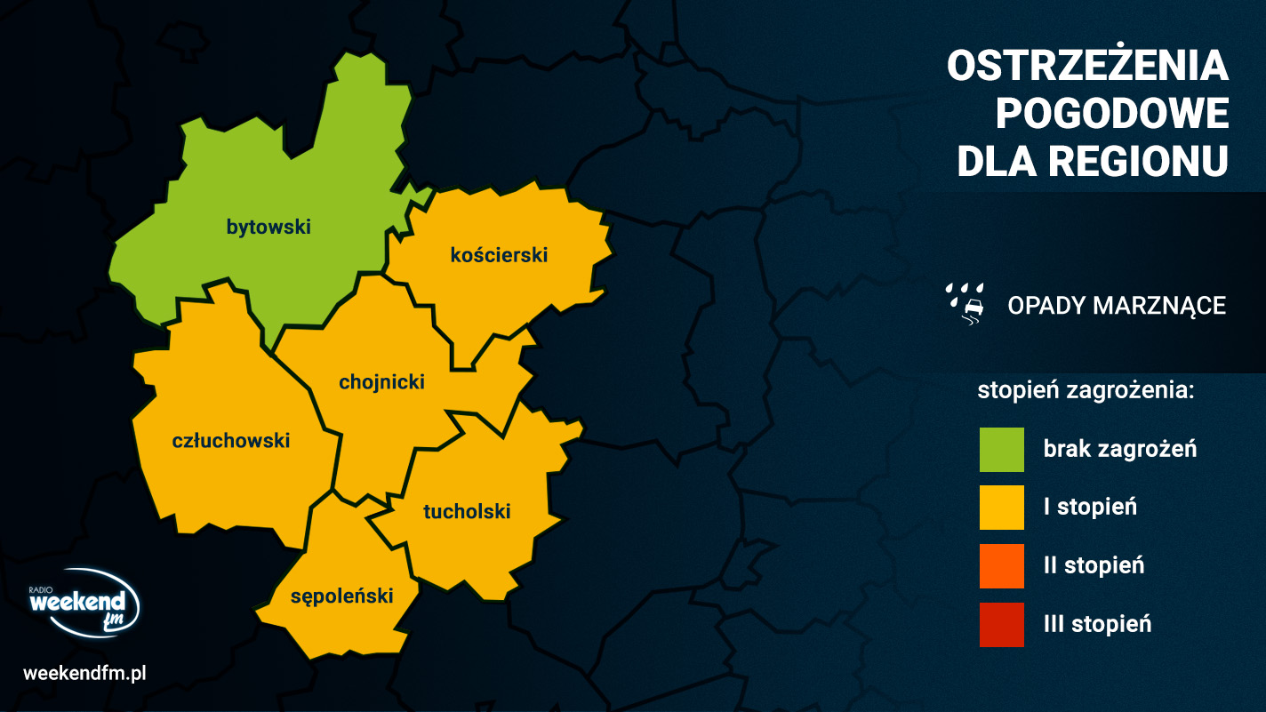 Instytut Meteorologii i Gospodarki Wodnej wydał w niedzielę 28 grudnia ostrzeżenie 1. stopnia przed marznącymi opadami. Ostrzeżenie dotyczy między innymi powiatów człuchowskiego, chojnickiego, kościerskiego, sępoleńskiego i tucholskiego.