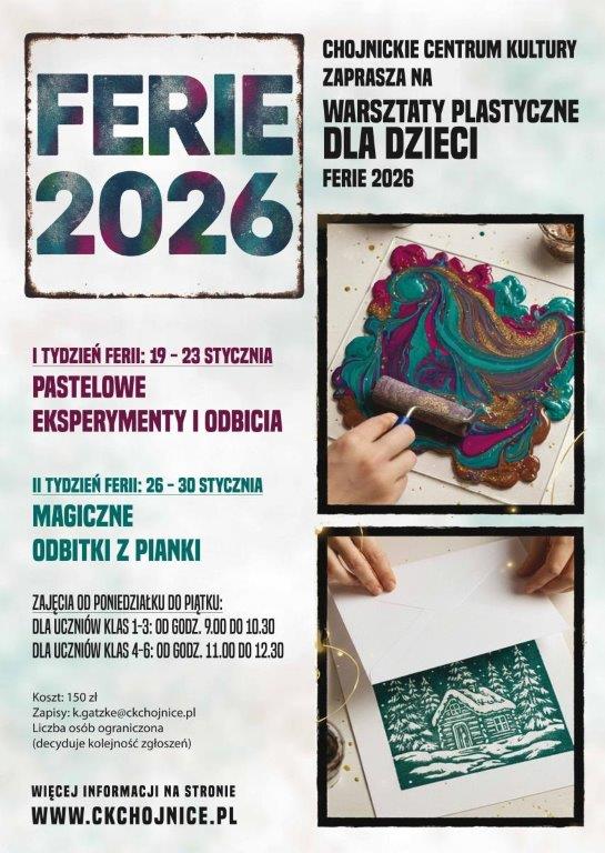 Zapraszamy do zapisywania się dzieci z klas 1-3 i 4-6. W pierwszym tygodniu będzie eksperymentowanie pastelami olejnymi i robienie z nich odbitek, a w drugim tygodniu dzieci poznają technikę piankorytu. W ferie zapraszamy również do kina Chojnickiego Centrum Kultury na dodatkowe seanse. Pełny repertuar Znajdziecie państwo na stronie ckchojnice.pl
