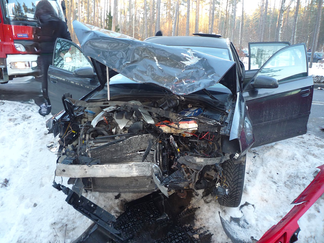 Policjanci ruchu drogowego wstępnie ustalili okoliczności tego zdarzenia. Z ulicy Kościelnej wyjeżdżał samochód marki Toyota, kierowany przez 74-letnią kobietę. Nie upewniła się ta pani, żeby ustąpić pierwszeństwo, wymusiła pierwszeństwo samochodowi marki Seat Leon, kierowanemu przez 41-latka. Doszło do zderzenia się. Siła uderzenia była tak duża że Seat Leon zjechał na przeciwległy pas ruchu i zderzył się czołowo samochodem Audi A3, kierowanym przez 20-latka. Dwoje pasażerów Audi A3, seniorów, zostało przetransportowanych z obrażeniami do kościerskiego szpitala.