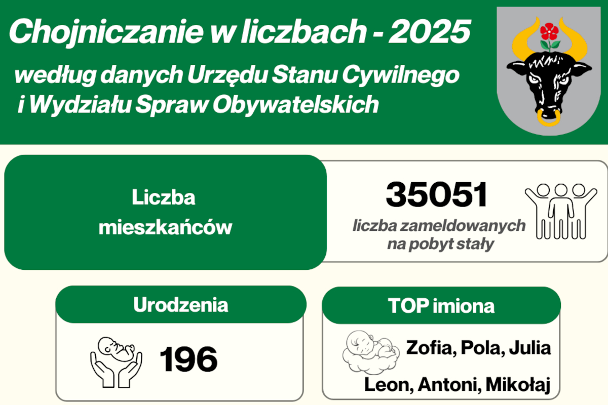 W naszym mieście na pobyt stały zameldowanych jest ponad 35 tys. mieszkańców. W tym roku urodziło się 196 dzieci, a najczęściej nadawane im imiona to Zofia, Pola, Julia oraz Leon, Antoni i Mikołaj. Odnotowano 232 małżeństwa, w tym 15 ślubów plenerowych. Pożegnaliśmy 398 osób. To liczby, które tworzą codzienność Chojnic.