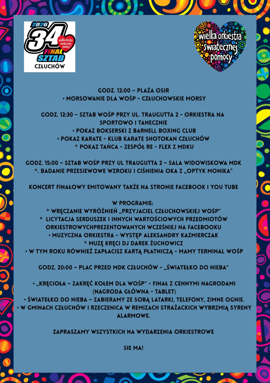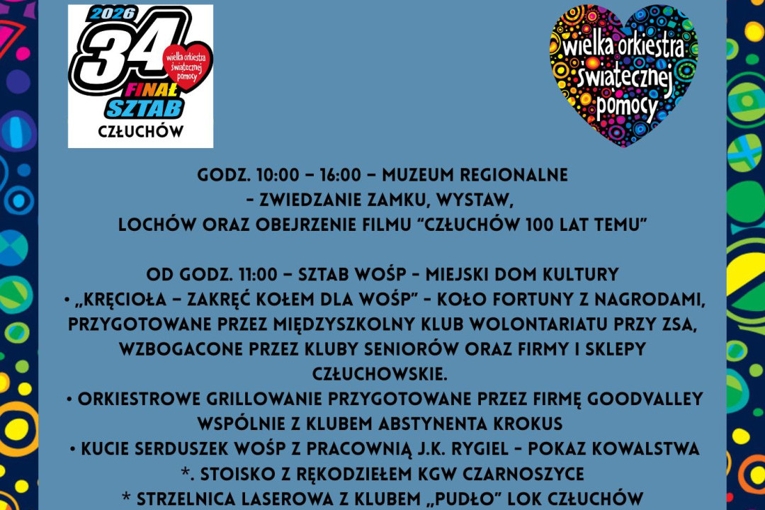 Sporo atrakcji zapewni dzisiaj (25.01) człuchowski sztab Wielkiej Orkiestry Świątecznej Pomocy. Zbiórka rozpoczęła się o godz. 8.00. siedzibą sztabu jest tradycyjnie Miejski Dom Kultury w Człuchowie. Koło MDK-u o godz. 11.00 rozpocznie się grillowanie, staną stoiska rękodzielnicze i strzelnica laserowa. Od godziny 10.00 możliwe będzie zwiedzanie lochów zamku krzyżackiego, a o 12.00 na plaży OSiR rozpocznie się wspólne morsowanie.