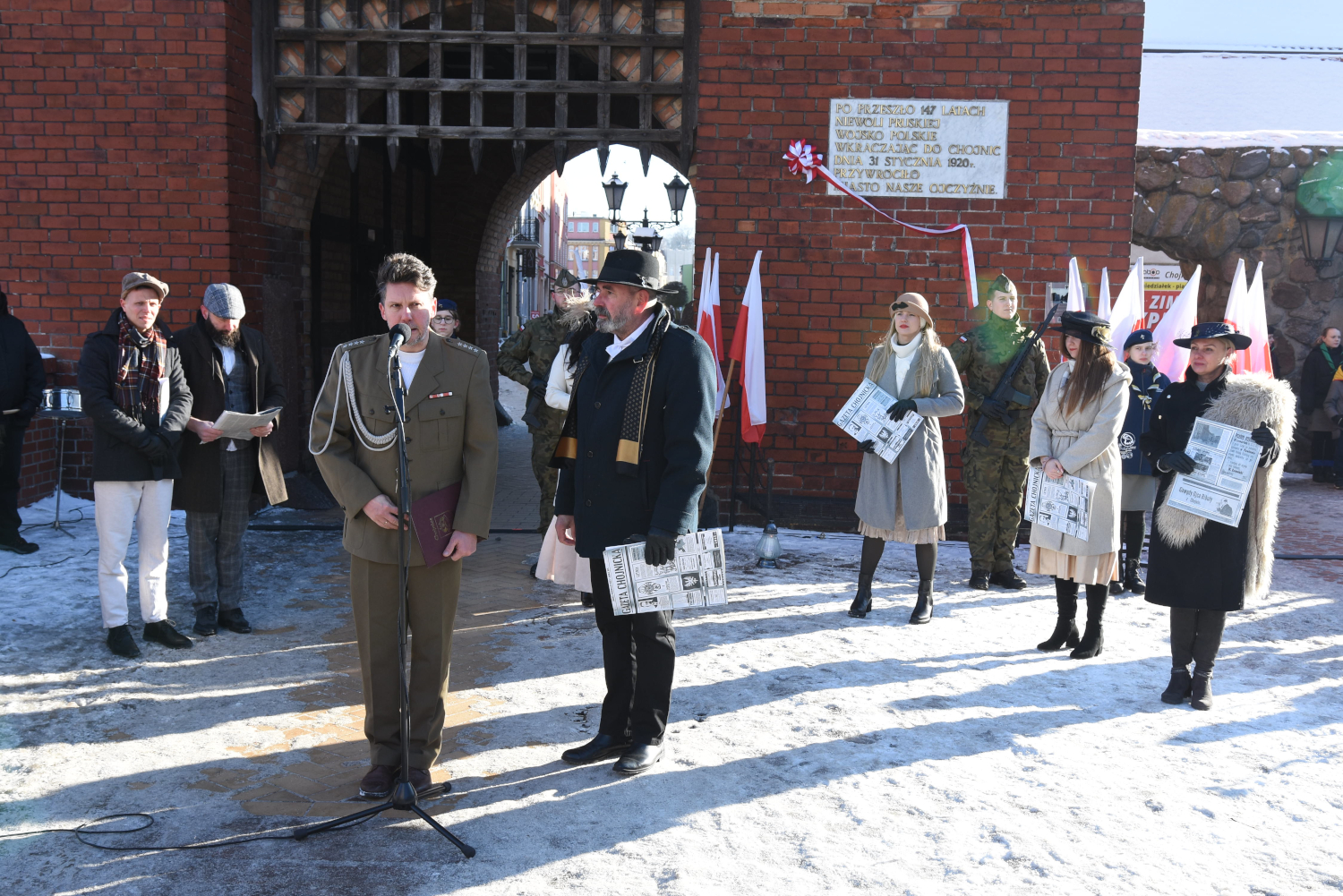 Chojnice świętują dzisiaj (31.01) 106. rocznicę powrotu do Macierzy. Pierwszą odsłoną obchodów był uroczysty apel koło Bramy Człuchowskiej. Zebrały się tutaj delegacje, poczty sztandarowe oraz zaproszeni goście. Wśród nich byli parlamentarzyści, samorządowcy oraz wyjątkowo kierownictwo Instytutu Pamięci Narodowej. Aktorzy Projektu 41 odegrali scenę ze swojego spektaklu o przejęciu władzy w mieście przez Alojzego Sobierajczyka. Były też okolicznościowe przemówienia.