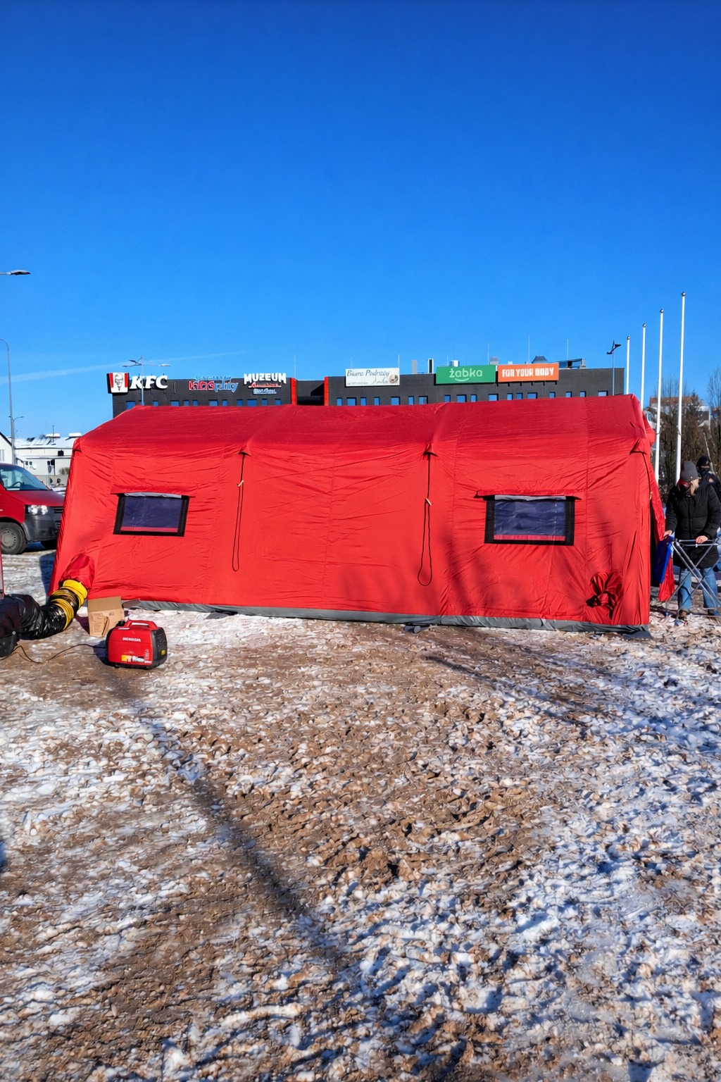 Kościerzyna reaguje na siarczyste mrozy. Na węźle komunikacyjnym przy pomniku Józefa Wybickiego stanął namiot pneumatyczny wyposażony w nagrzewnice. Sprzęt zakupiono w ramach dotacji z Programu Ochrony Ludności i Obrony Cywilnej.