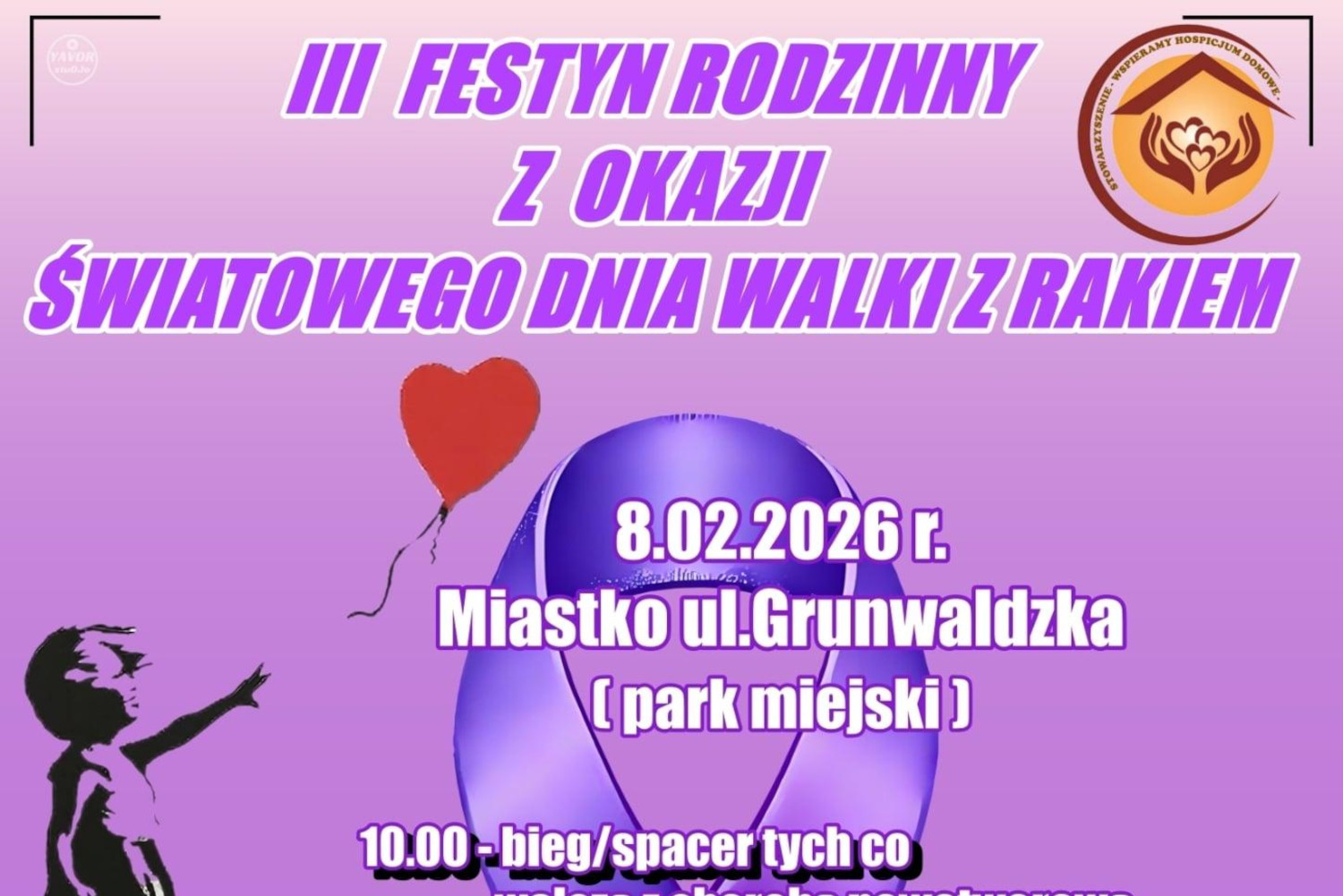 W Miastku po raz trzeci odbędzie się Festyn Rodzinny z okazji Światowego Dnia Walki z Rakiem. Niedzielne (8.02) wydarzenie jest organizowane z myślą o osobach zmagających się z chorobą nowotworową i ich rodzinach. Przy okazji będzie można wesprzeć Hospicjum Domowemu w Miastku. Tym razem miejscem imprezy będzie park przy ulicy Grunwaldzkiej, vis a vis urzędu miasta. Impreza rozpocznie się o godz. 10.00 biegiem lub spacerem dla osób chorych i wspierających. Od 11.00 rozpoczną się występy artystyczne i licytacje. Na 12.00 zaplanowano wzruszającą kulminację festynu.