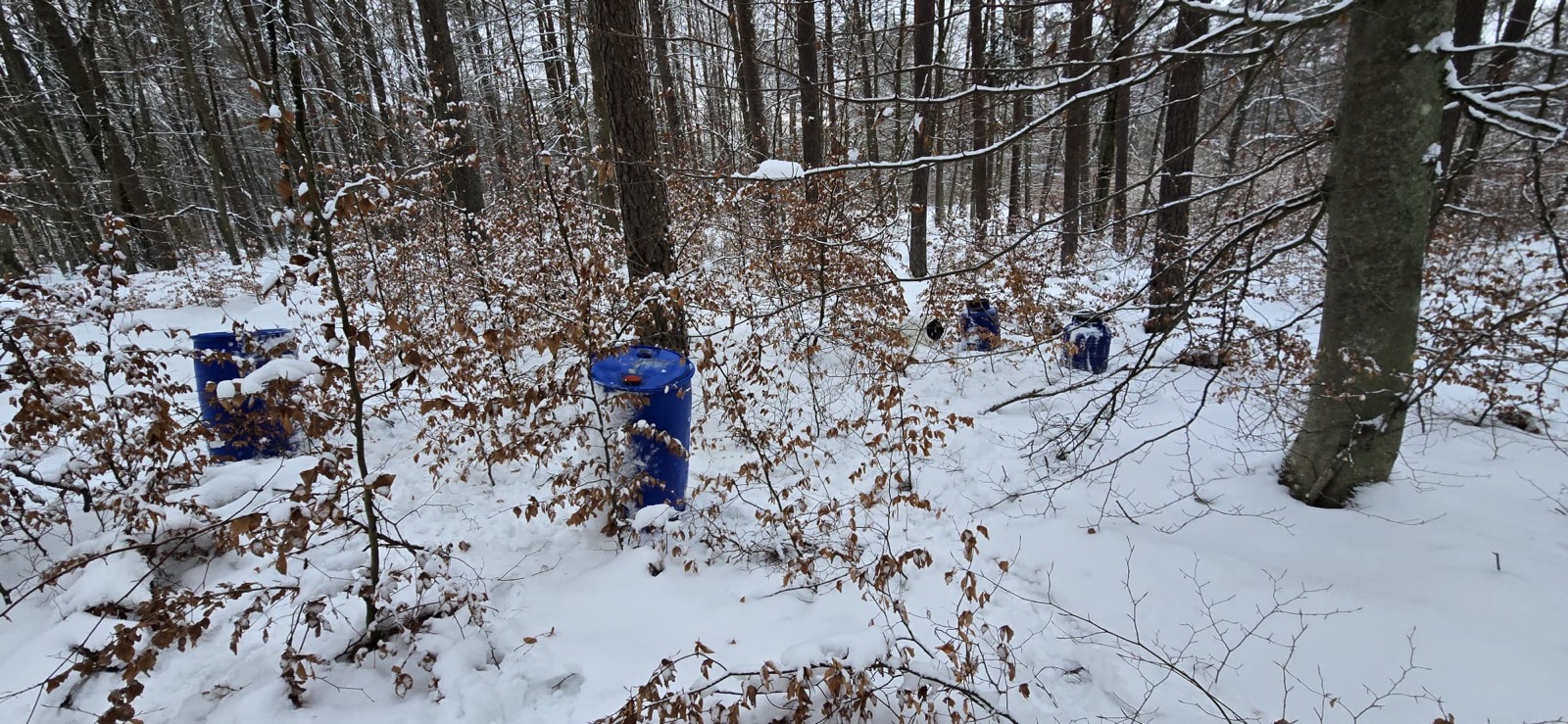 Pięć plastikowych beczek prawdopodobnie z resztkami kwasu solnego ujawniono w lesie w Szarlocie koło Kościerzyny