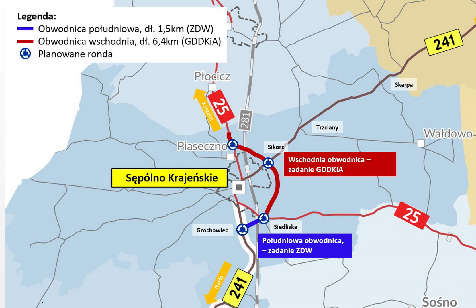 Dobiegają końca prace projektowe dotyczące tak zwanej "małej obwodnicy" Sępólna Krajeńskiego. Ma ona wyprowadzić ruch samochodowy z kierunku Poznania na tą właściwą obwodnicę miasta, która ma być gotowa pod koniec 2028 roku. Mała obwodnica to około półtora-kilometrowy odcinek drogi wojewódzkiej 241, dlatego za jej projekt i budowę odpowiada Zarząd Dróg Wojewódzkich w Bydgoszczy.
