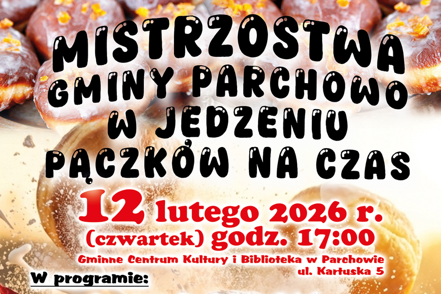 Mistrzostwa Gminy Parchowo w jedzeniu pączków na czas. 12 lutego o 17:00 w Gminnym Centrum Kultury w Parchowie. Śmiałkowie będą mieli za zadanie zjeść pięć pączków z marmoladą, z lukrem. Chodzi o dobrą zabawę, dobre humory. Na scenie zaprezentuje się grupa z muzyką na żywo. zespół Cukier Puder, prowadzącym będzie pan Robert Jakubek.