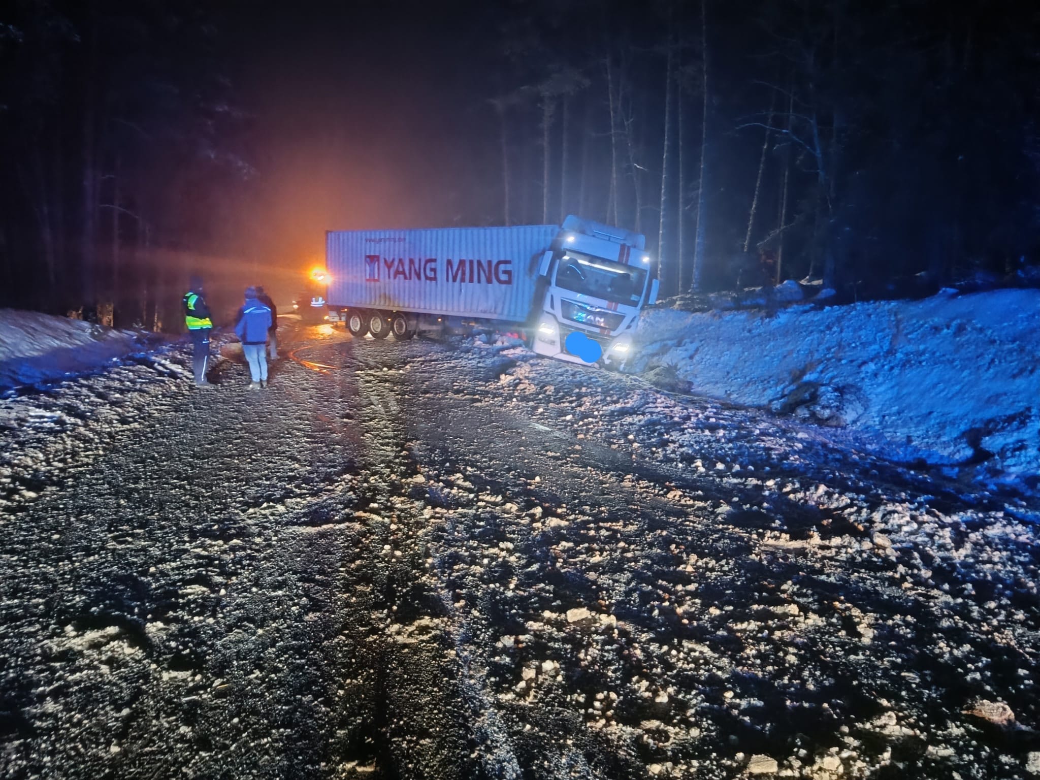 Zablokowana droga wojewódzka 235 na odcinku Korne-Lipusz. Ciężarówka stoi w poprzek jezdni