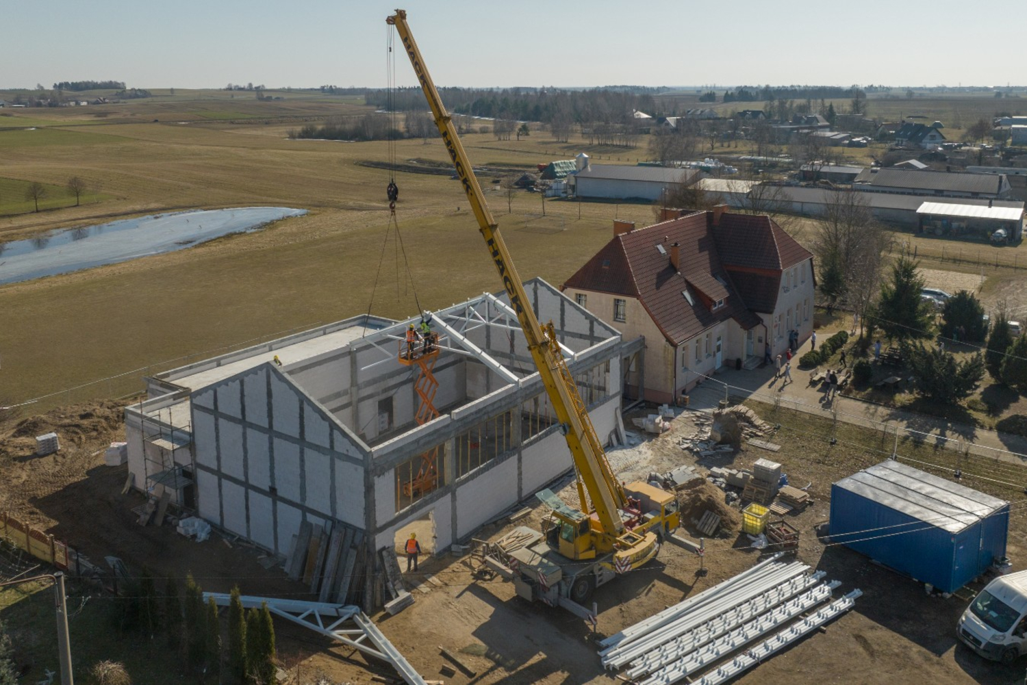 Wcześniej wykonano ściany fundamentowe, ściany budynku, strop żelbetowy i ściany kolankowe, co w kolejności umożliwiło przejście do prac związanych z budową zadaszenia obiektu. Ten etap inwestycji właśnie trwa, prace postępują, zostaną zakończone jeszcze w tym roku. Oddanie sali do użytku planujemy na początku roku szkolnego.