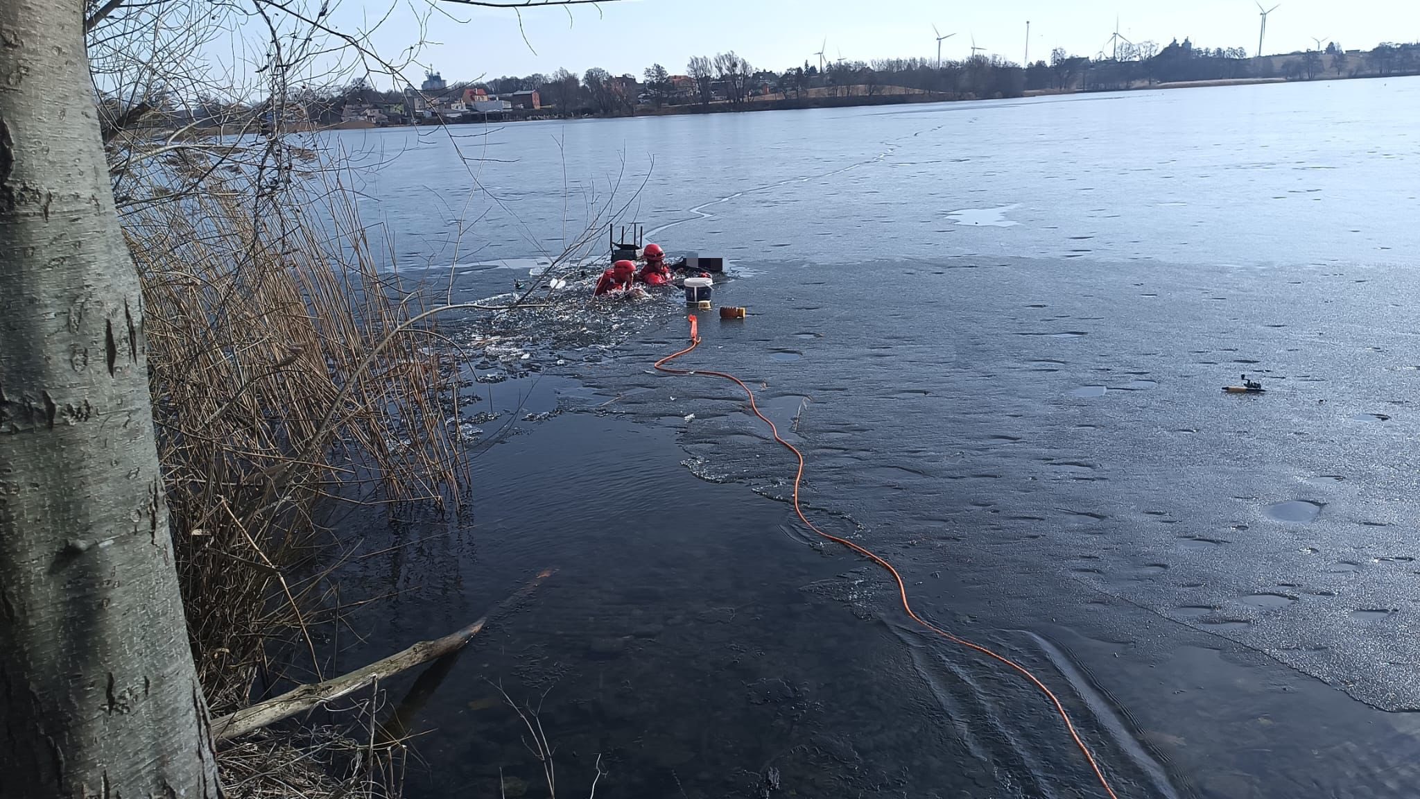 Na miejscu interweniowali policjanci, ratownicy medyczni oraz pięć zastępów straży pożarnej. Właśnie strażakom udało się wydobyć mężczyznę na brzeg.