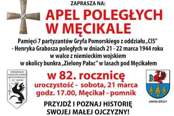 W sobotę 21 marca pod pomnikiem w Męcikale o godz. 17:00 organizujemy apel poległych, będziemy wspominać poległych partyzantów Gryfa Pomorskiego, którzy poprzez swoją walkę w czasie okupacji tworzyli ciągłość państwa polskiego. Będzie to uroczystość dla wszystkich mieszkańców gminy Brusy, powiatu chojnickiego i nie tylko. Zapraszamy do wzięcia udziału, aby poznać lokalną historię naszej małej ojczyzny.