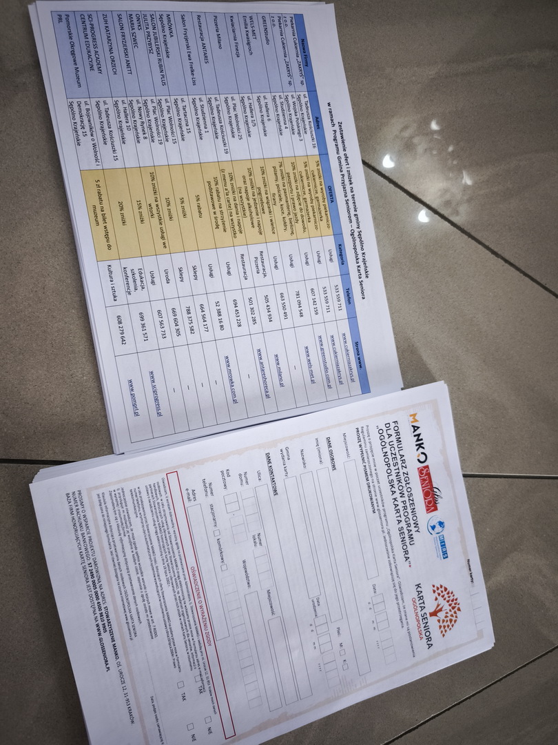 - Żeby uzyskać taką kartę, należy się do nas zgłosić razem z formularzem zgłoszeniowym wypełnionym, z dowodem osobistym osobiście przychodzimy do mnie do biura nr 21, i tam ja będę, na podstawie weryfikacji danych z dowodu, wydawała ogólnopolską Kartę Seniora. Senior tylko może tą kartę używać sam osobiście.
