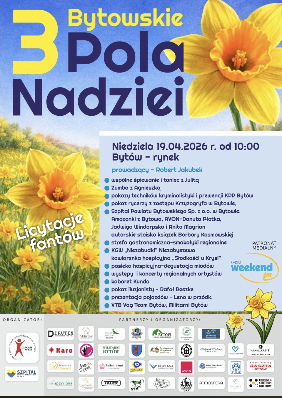 O 3. Bytowskich Polach Nadziei organizatorzy akcji mówili w czwartek (16.04) w studiu Weekend FM. Gośćmi Darka Żuchowicza byli prezes Szpitala Powiatowego Beata Hinc i koordynator domowego hospicjum Paweł Wichłacz.