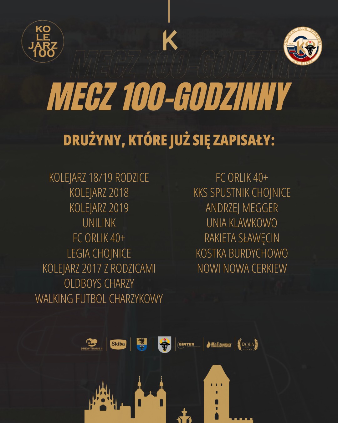 Kolejarz Chojnice świętuje w tym roku 100-lecie, a jednym z głównych punktów obchodów będzie mecz 100 godzinny. Rozpocznie się 24 czerwca o 8.00, a zakończy 28 czerwca o 12.00. Będzie podzielony na 200 spotkań po 25 minut. Potrzeba więc 400 pięciosobowych drużyn. O tym jak dołączyć do tego niezwykłego wydarzenia w studiu Weekend FM w rozmowie z Darkiem Żuchowiczem mówili wczoraj (23.04) prezes Jacek Zakrzewski oraz członkowie zarządu Tomasz Sujak i Wojciech Sobczak.