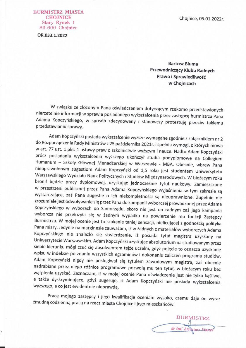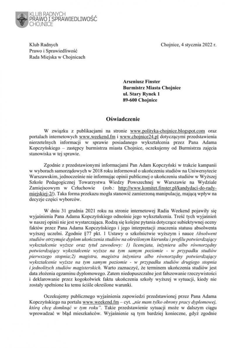 Zapytany przez Weekend FM wiceburmistrz Kopczyński mówił, że "w żadnym materiale wyborczym nie powiedział, że jest magistrem. - Czuję się absolwentem UW, bo uzyskałem absolutorium. Skończyłem te studia, ale bez tytułu magistra " - powiedział nam Adam Kopczyński. Do tej sprawy odniósł się również chojnicki Klub Radnych Prawa i Sprawiedliwości: