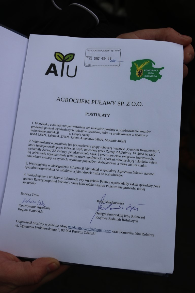 On oraz inni rolnicy protestujący wczoraj (9.02.) w Rychnowach zakończyli manifestację wizytą w siedzibie producenta nawozów w Człuchowie. Szefostwu firmy przedstawili cztery postulaty.