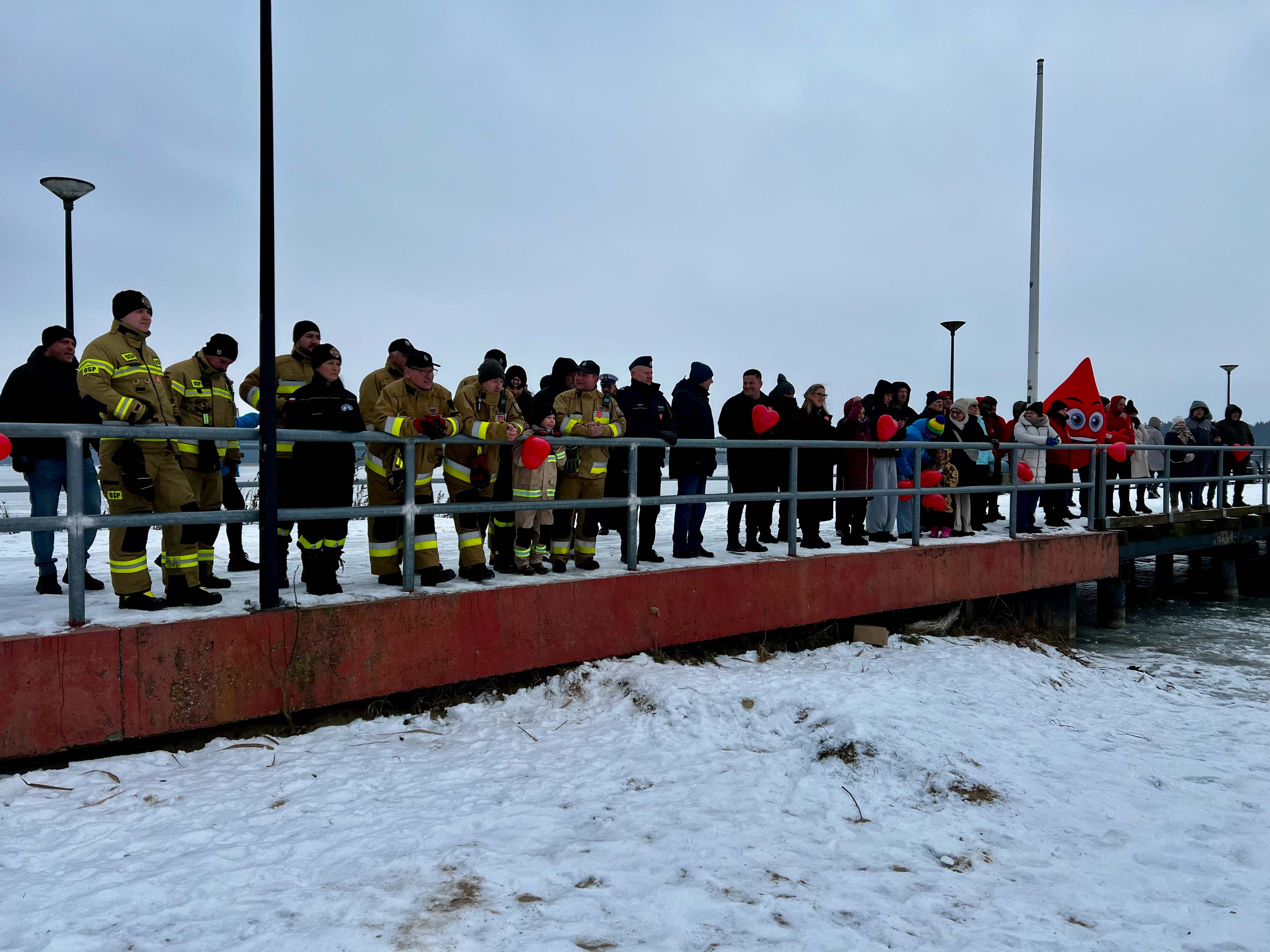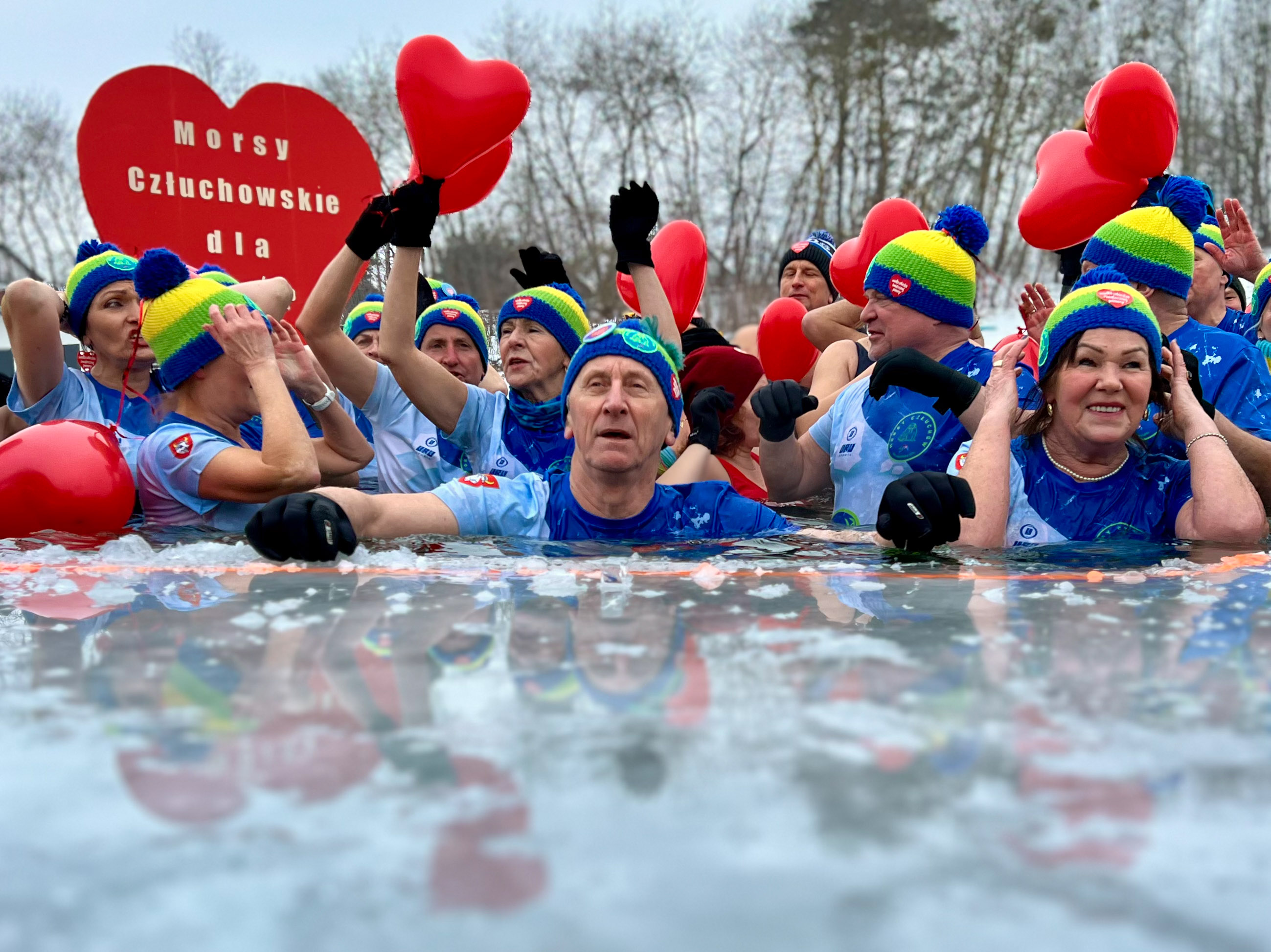 W samo południe dla WOŚP w lodowatej wodzie Jeziora Rychnowskiego zanurzyły się człuchowskie Morsy.