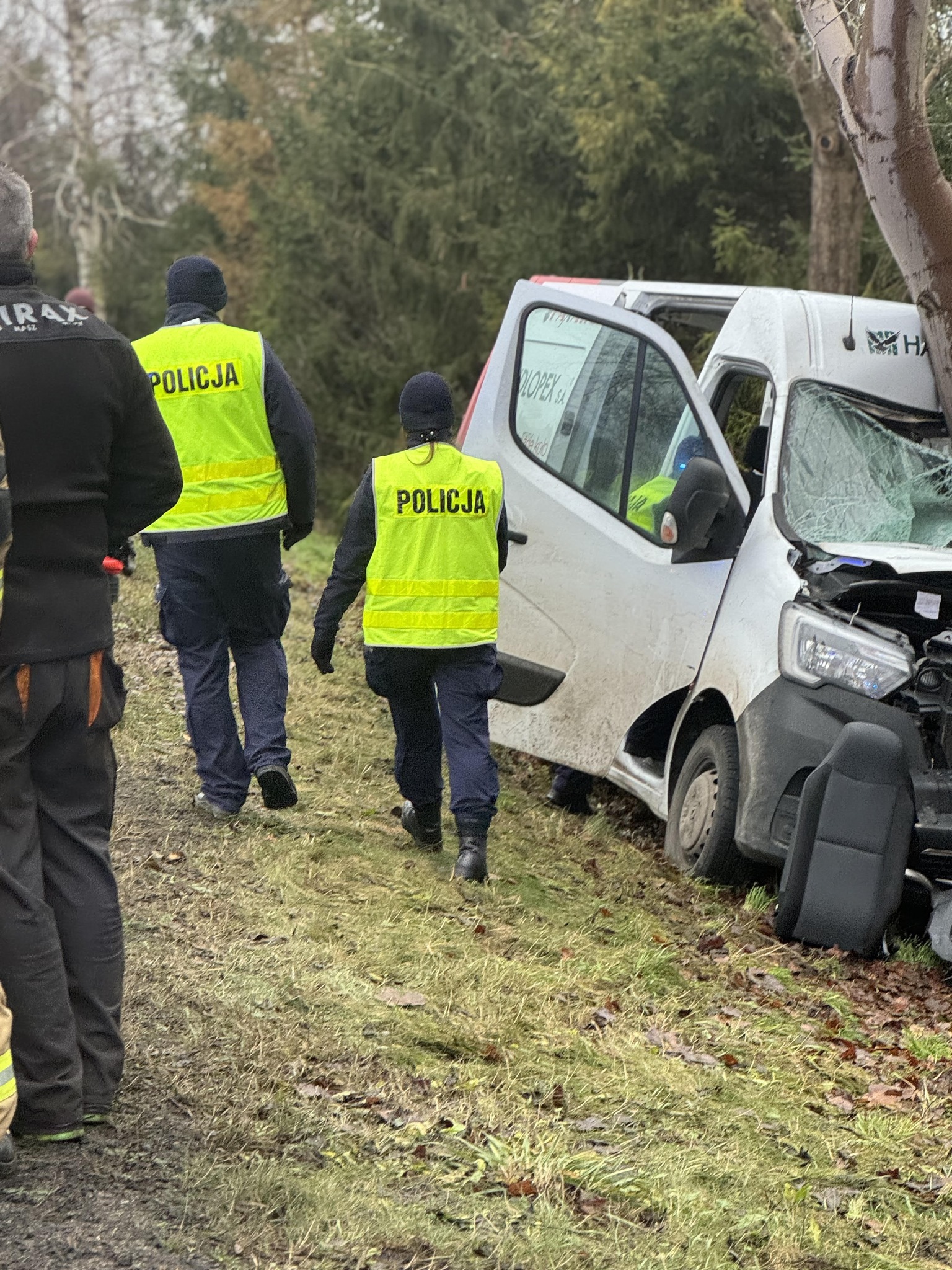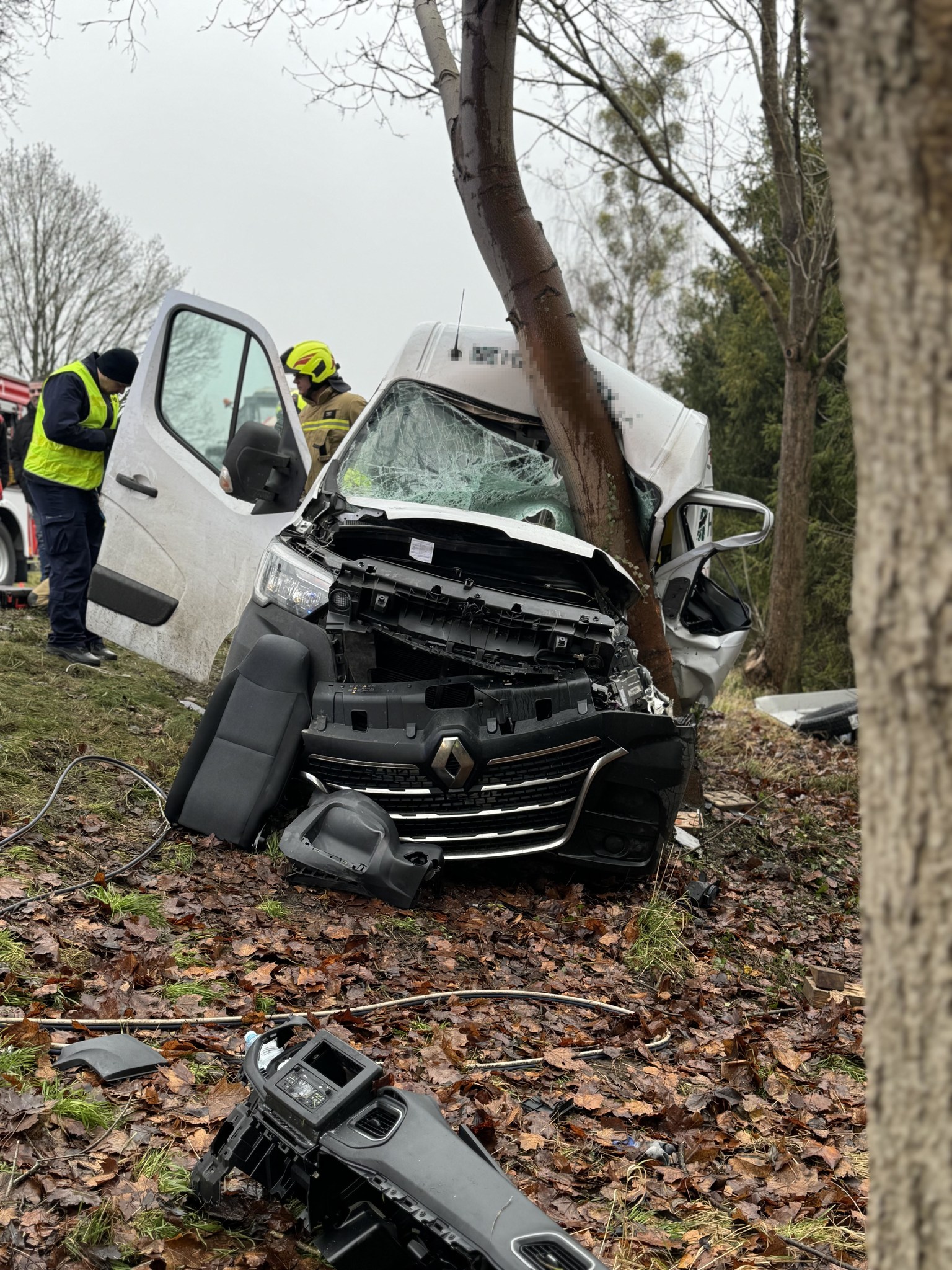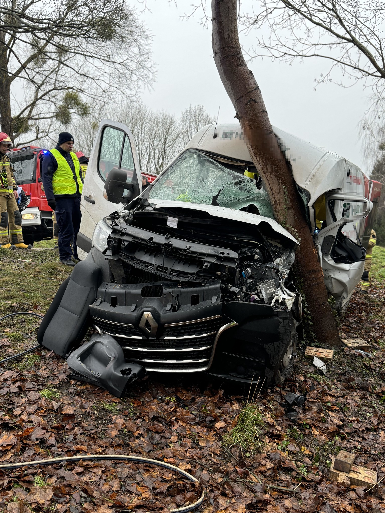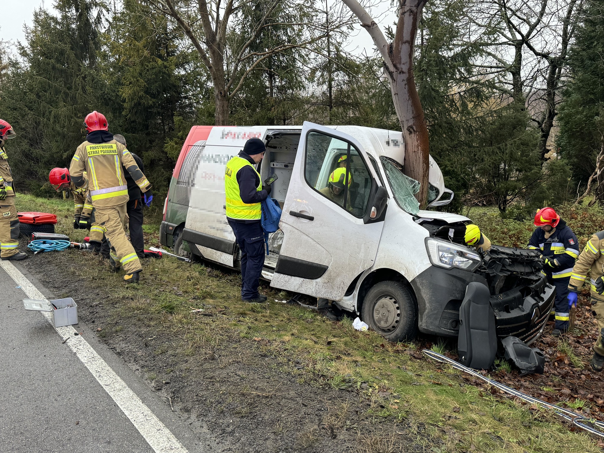 Kierujący autem dostawczym ucierpiał w wypadku na krajowej 20 w Tuchomiu. Dzisiaj (09.12) około godz 11.00 renault wypadło z drogi i uderzyło w drzewo. Na miejscu trwają jeszcze działania służb.