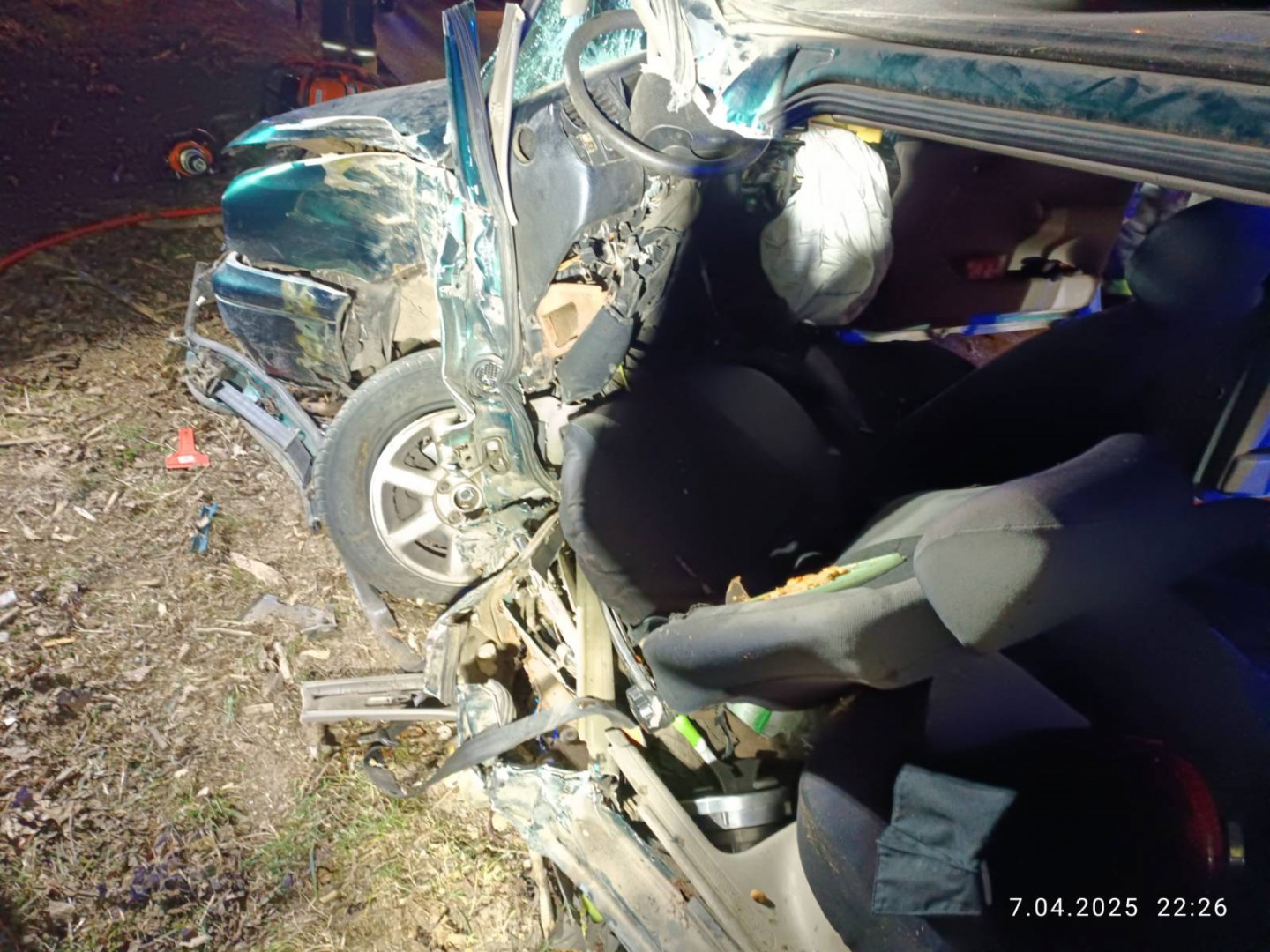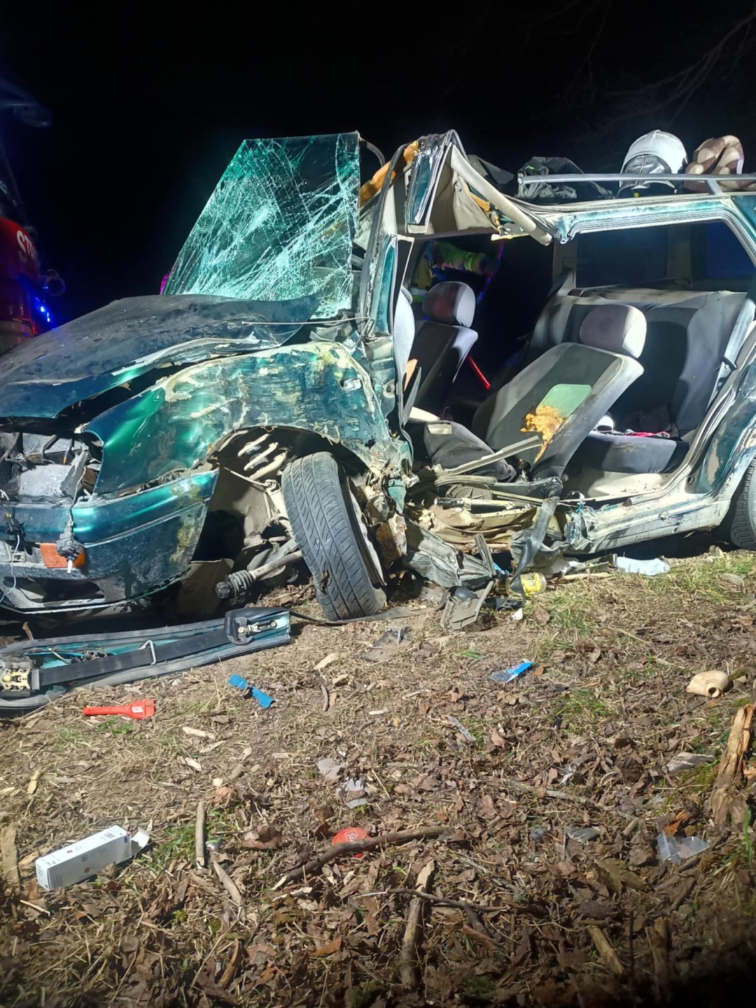 Przybyłe na miejsce zastępy zastały samochód osobowy po uderzeniu w drzewo. Samochodem podróżował tylko kierujący, 50-letni mężczyzna. Poszkodowany był przytomny, zakleszczony w pojeździe. Działania polegały na wykonaniu dostępu do poszkodowanego przy użyciu narzędzi hydraulicznych i udzieleniu kwalifikowanej pierwszej pomocy. Następnie przekazano rannego pod opiekę Zespołu Ratownictwa Medycznego, który po przebadaniu przez ratowników medycznych został zabrany do szpitala.