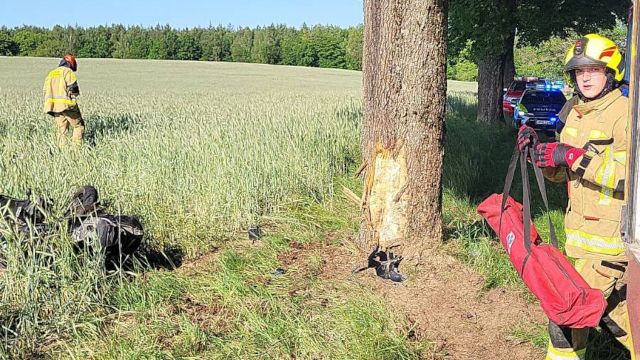 Zastępy zastały motocykl po uderzeniu w drzewo znajdujący się na polu. Obok leżał przytomny motocyklista. Strażacy udzielili mu kwalifikowanej pierwszej pomocy i przetransportowali go do karetki Zespołu Ratownictwa Medycznego. Na miejsce zdarzenia przyleciał śmigłowiec Lotniczego Pogotowia Ratunkowego, który zabrał poszkodowanego do szpitala.