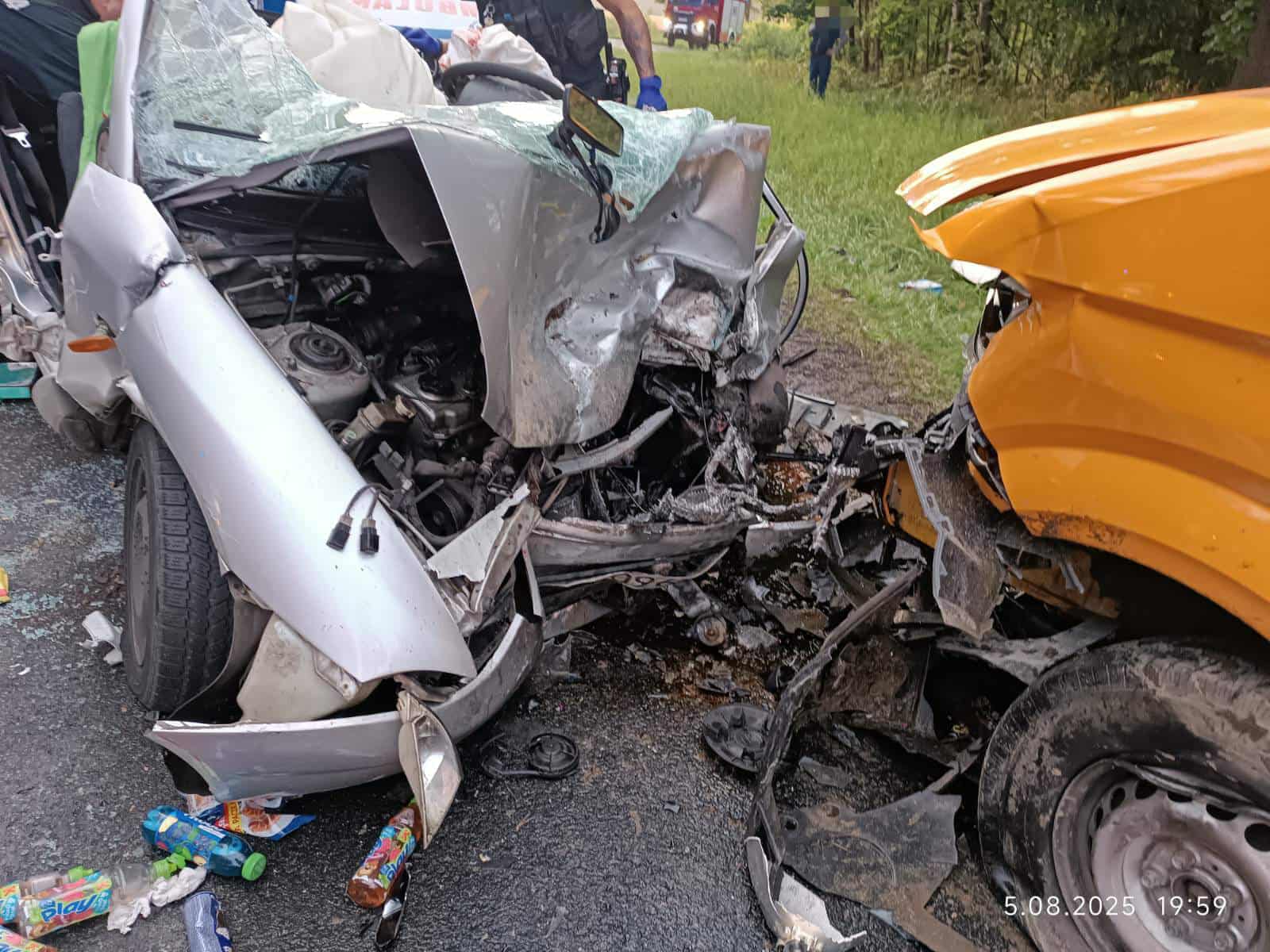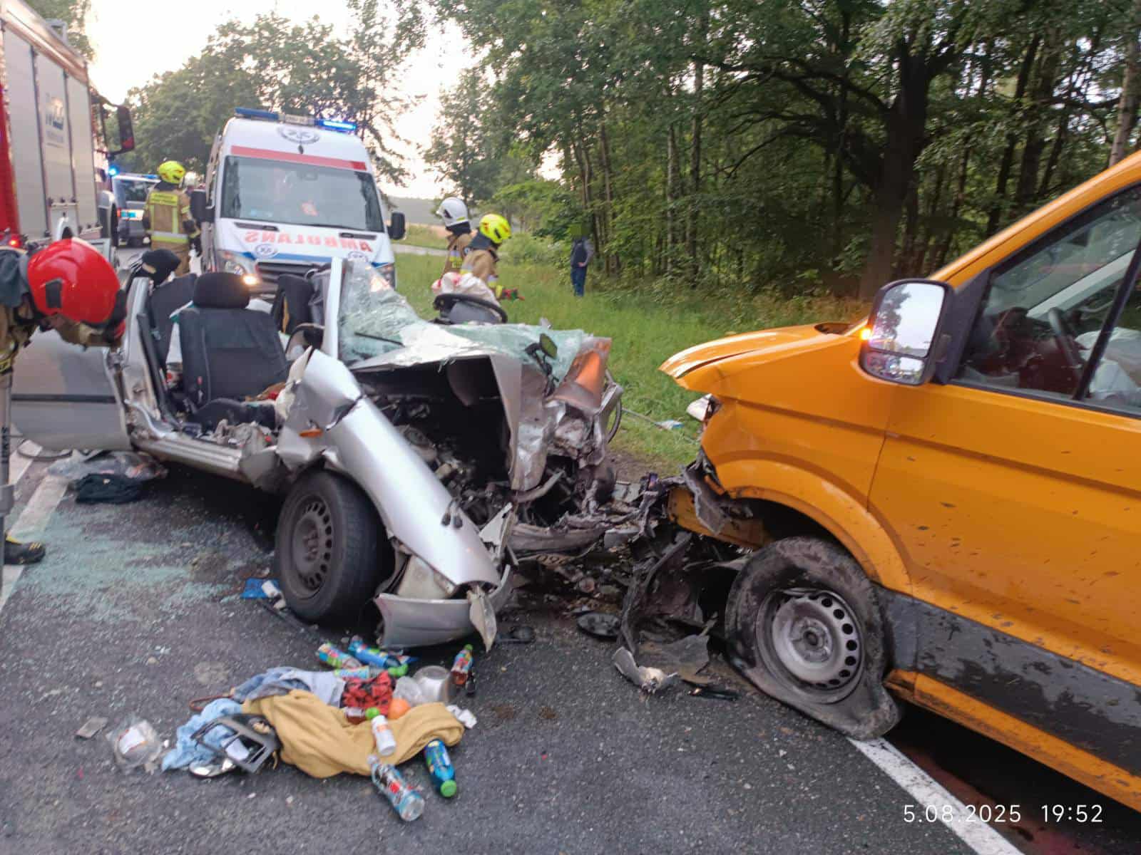 Zastępy zastały samochód osobowy po zderzeniu z samochodem dostawczym. Pojazdami podróżowali tylko kierujący mężczyźni. Na miejscu zdarzenia był patrol policji i Zespół Ratownictwa Medycznego, który udzielał pomocy kierowcy samochodu dostawczego. Kierowca samochodu osobowego był zakleszczony w pojeździe. Działania polegały na wykonaniu do poszkodowanego przy użyciu narzędzi hydraulicznych i pomocy w przetransportowaniu rannego do karetki. Poszkodowani zostali zabrani do szpitala.