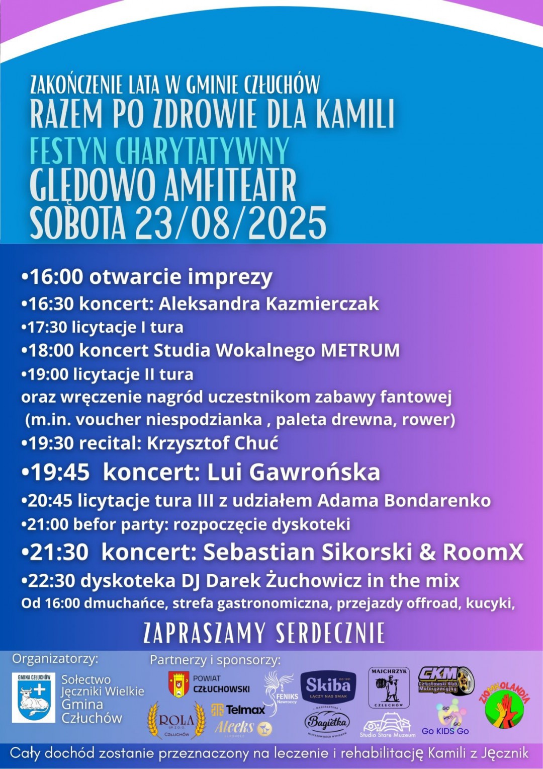 Festyn charytatywny "Razem po zdrowie dla Kamili" to zarazem zakończenie lata w gminie Człuchów. Impreza odbędzie się w amfiteatrze w Ględowie. Zagrają m.in. Aleksandra Kazmierczak, RoomX i Sebastian Sikorski oraz Luiza "Lui" Gawrońska. Będzie też dyskoteka z Darkiem Żuchowiczem. Zaplanowano równieś smakołyki od kół gospodyń wiejskich, przejażdżki offroadowe i bryczką i strefę zabaw dla dzieci. Wszystko potrwa od 16.00 do 2.00 w nocy.