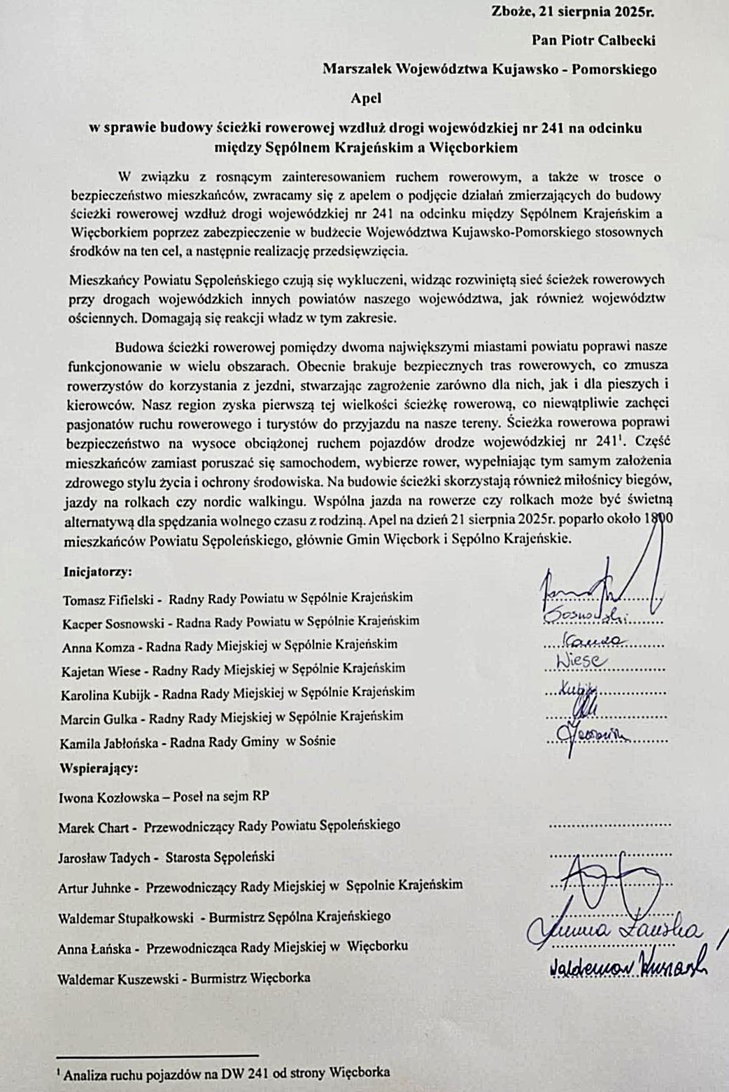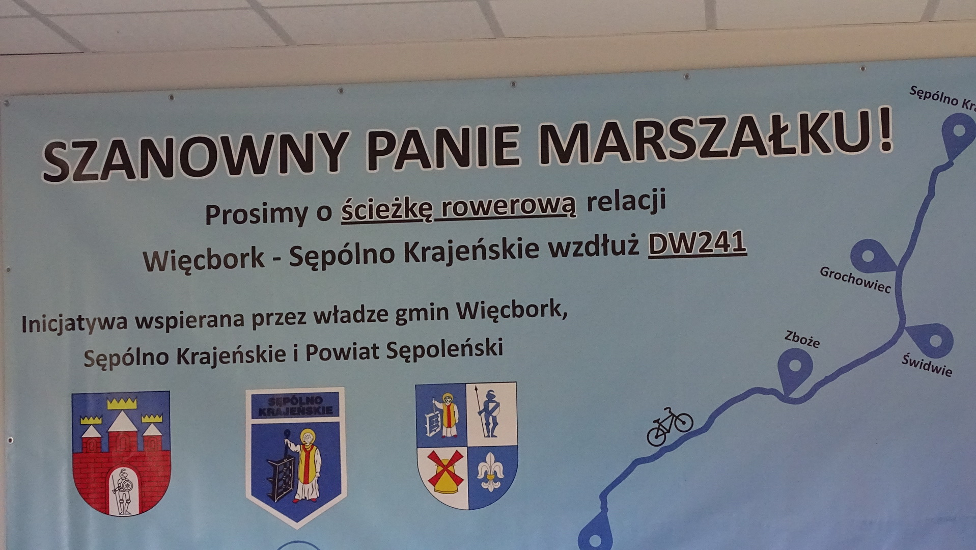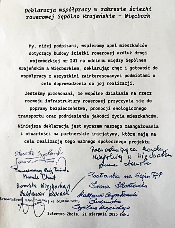 Apel, deklaracja poparcia i uchwały rad miejskich oraz powiatu. Wszystko to ma trafić do marszałka województwa kujawsko- pomorskiego, a dotyczy budowy ścieżki rowerowej między Sępólnem a Więcborkiem. W czerwcu i lipcu radni ugrupowania "Nasz powiat nasze gminy" zbierali podpisy pod apelem do marszałka, który wsparło 1800 mieszkańców tych dwóch gmin: