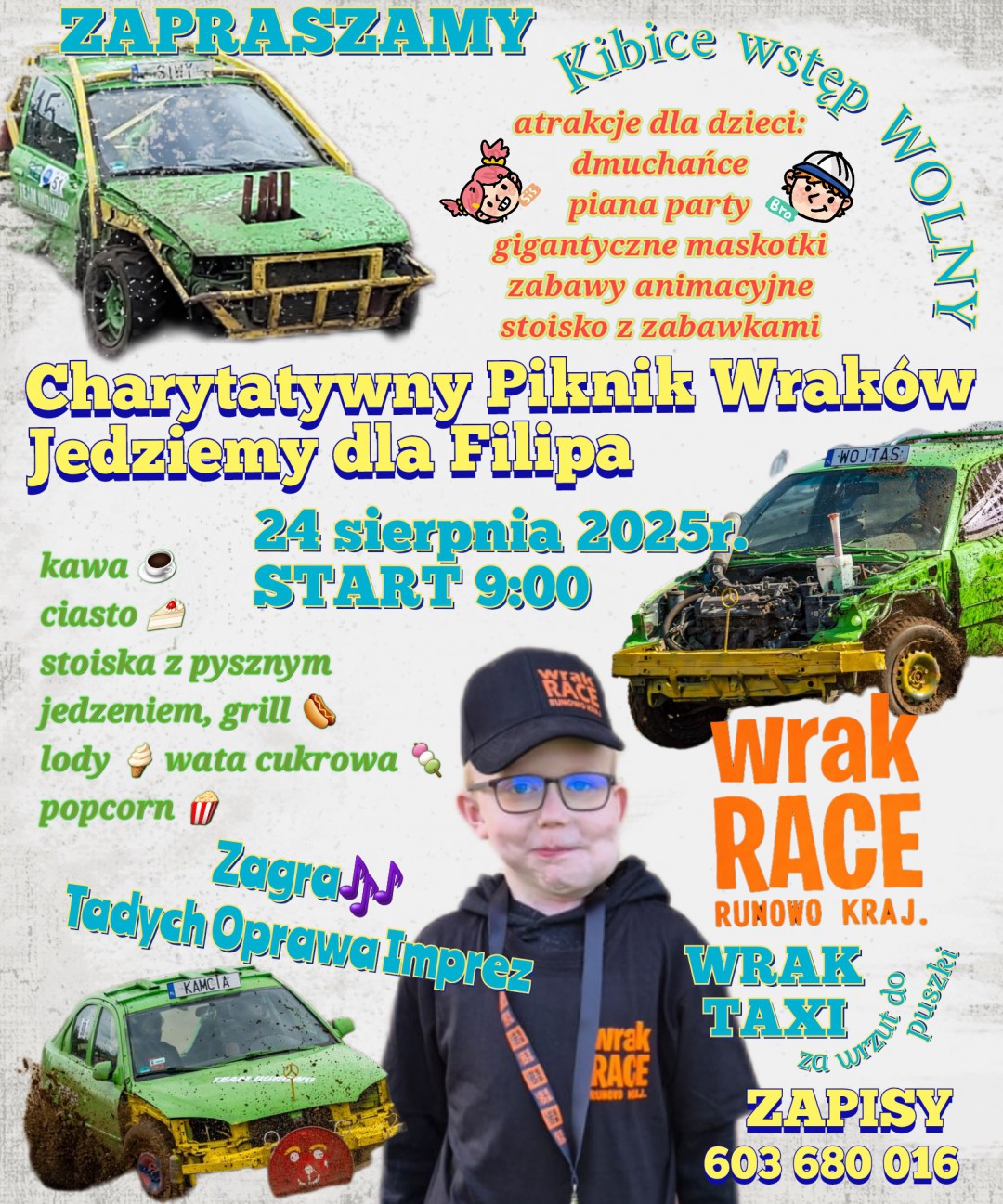 Ponad 60 załóg weźmie udział w dzisiejszych (24.08) wyścigach wraków samochodowych w powiecie sępoleńskim. Kolejna taka impreza odbędzie się w Runowie Krajeńskim w gminie Więcbork. Również i tym razem impreza będzie miała wymiar charytatywny, bo dochód zostanie przeznaczony na leki dla Filipa Śledzia z Wituni.