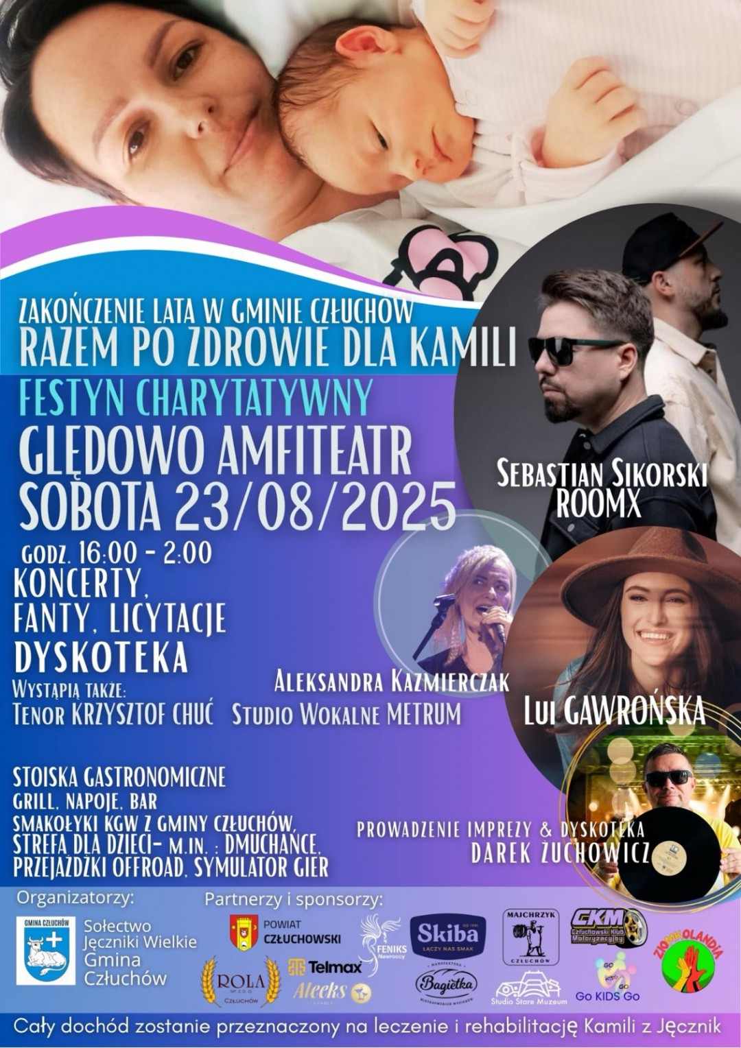 Kamila Pacha z Jęcznik Wielkich niedawno doczekała się trzeciej córki, ale jednocześnie straciła sprawność. Mieszkanka gminy Człuchów jest sparaliżowana od mostka w dół, odkąd w zaawansowanej ciąży rozlał się jej krwiak na rdzeniu kręgowym. Nadzieją na powrót do sprawności jest kosztowna rehabilitacja. W dużej mierze ma zostać opłacona dzięki festynowi charytatywnemu "Razem po zdrowie dla Kamili", który dziś (23.08) odbędzie się w amfiteatrze Ględowie.