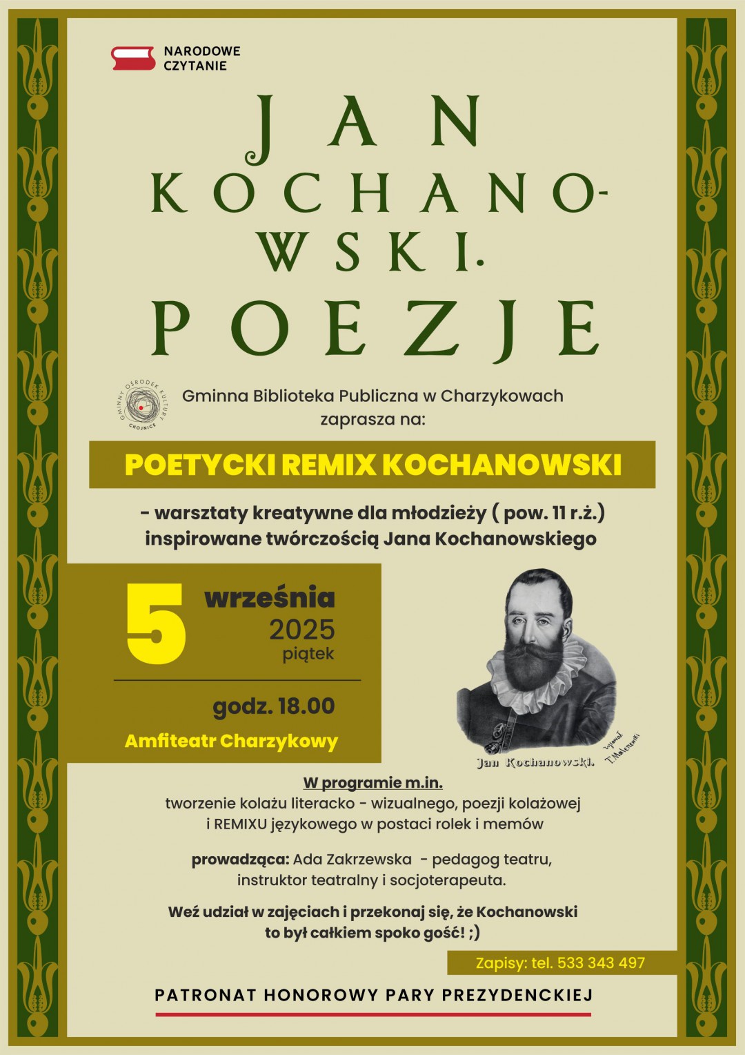 O godz. 18.00 odbędą się także warsztaty kreatywne dla młodzieży inspirowane twórczością Jana Kochanowskiego.