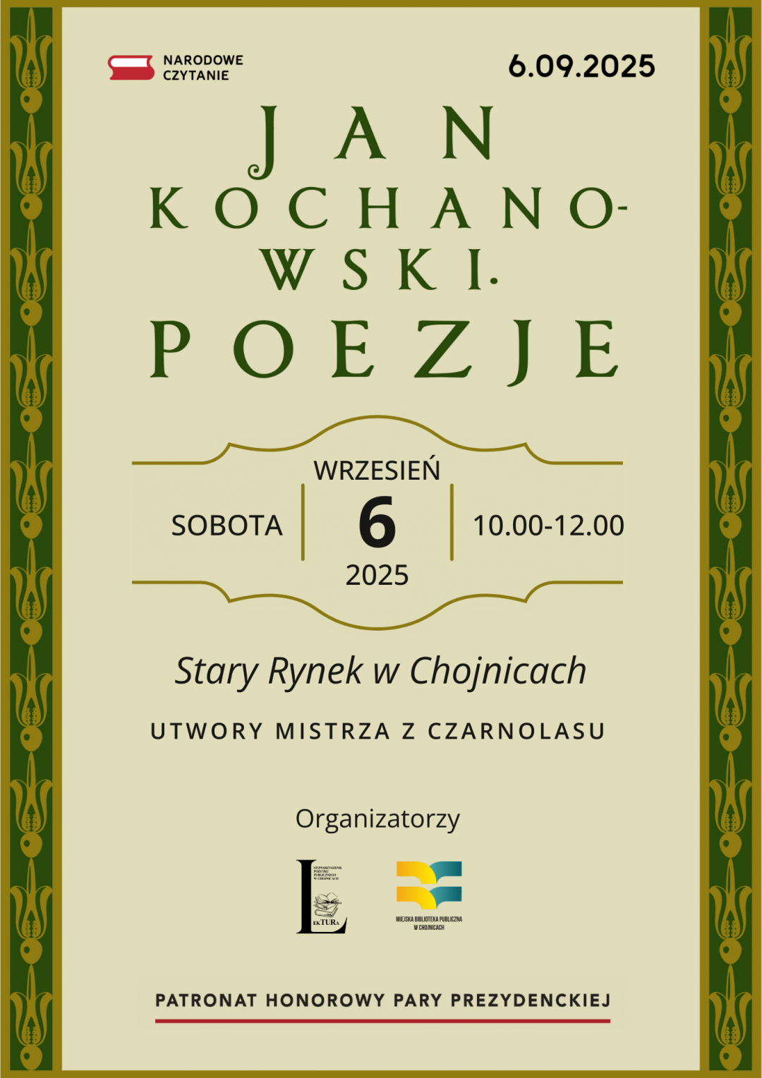 Z kolei w sobotę o godz. 10.00 rozpocznie się Narodowe Czytanie na chojnickim Starym Rynku. Tutaj dzieła mistrza będą czytać bibliotekarze oraz zaproszeni goście. Jeden z trenów zostanie odczytany w języku kaszubskim. W razie niepogody impreza przeniesie się do Czytelni Miejskiej Biblioteki Publicznej w Chojnicach.