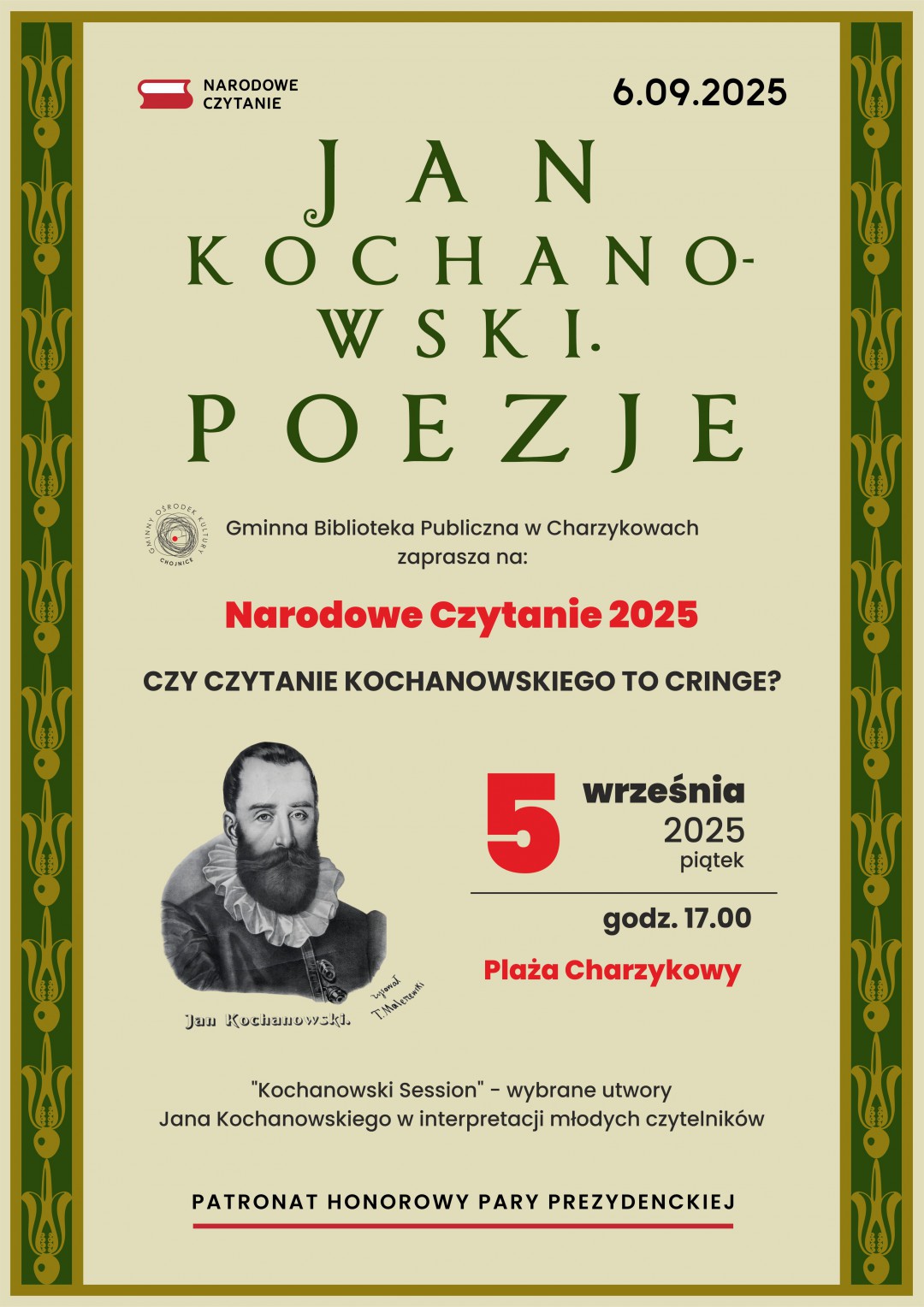 W piątek (5.09) w Charzykowach, a w sobotę (6.09) w Chojnicach odbędzie się tegoroczne Narodowe Czytanie. Wydarzenie pod patronatem Pary Prezydenckiej tym razem skupia się na twórczości Jana Kochanowskiego. Czytanie w Charzykowach odbędzie się już w piątek. Tu zaplanowano Poetycki Remix Kochanowski.