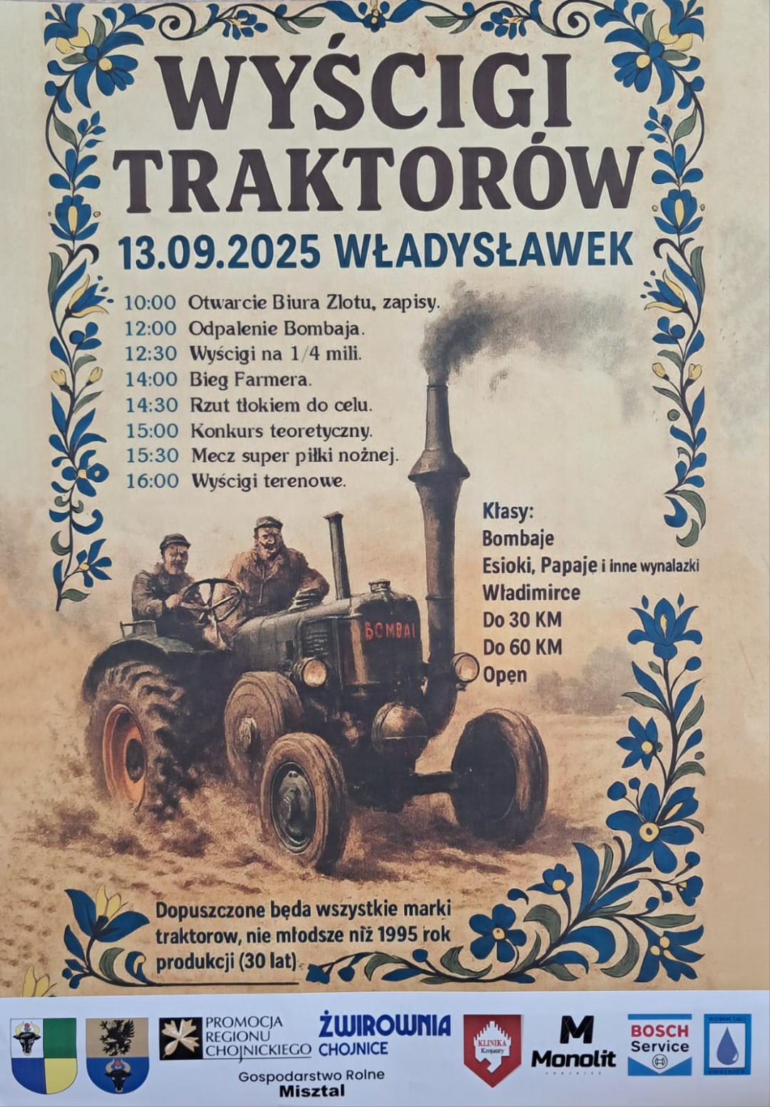 Będzie podział na kategorię traktorów. Pierwsza kategoria to będą papaje, samoróbki, esioki. Kategoria 30 koni mechanicznych, 60, powyżej 60. Jest osobna kategoria przewidziana dla władimirców, no i na koniec myślę najbardziej widowiskowa kategoria open. Tam będzie mógł się ścigać każdy z każdym. Atrakcyjne nagroda, głównymi nagrodami będą przeloty motolotnią. Zapraszam, przewidziane są też atrakcje dla dzieci.