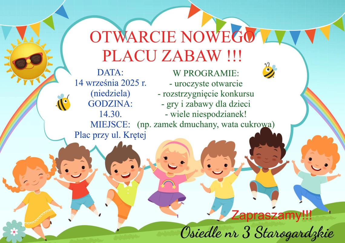 Bardzo serdecznie zapraszam na otwarcie nowego placu zabaw, który został wybudowany na Osiedlu Starogardzkim w Czersku. Jest to plac zabaw posadowiony w miejscu, gdzie kilkadziesiąt lat temu dzieci mogły się bawić, grac w piłkę. Bardzo, bardzo się cieszę, ponieważ to też było moim celem, ale też celem zarządu Osiedla Starogardzkiego. Rodzice, dzieci, dziadkowie będą mieli miejsce, gdzie będą mogli spędzić razem czas.