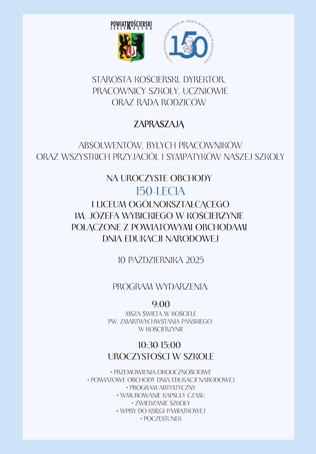 Już teraz dyrekcja I LO zachęca wszystkich absolwentów, pracowników i sympatyków szkoły do udziału w piątkowych uroczystościach. Te rozpoczną się o godzinie 9.00 od mszy świętej w kościele pw. Zmartwychwstania Pańskiego w Kościerzynie. Z kolei o godzinie 10.30 rozpoczną się uroczystości w szkole: