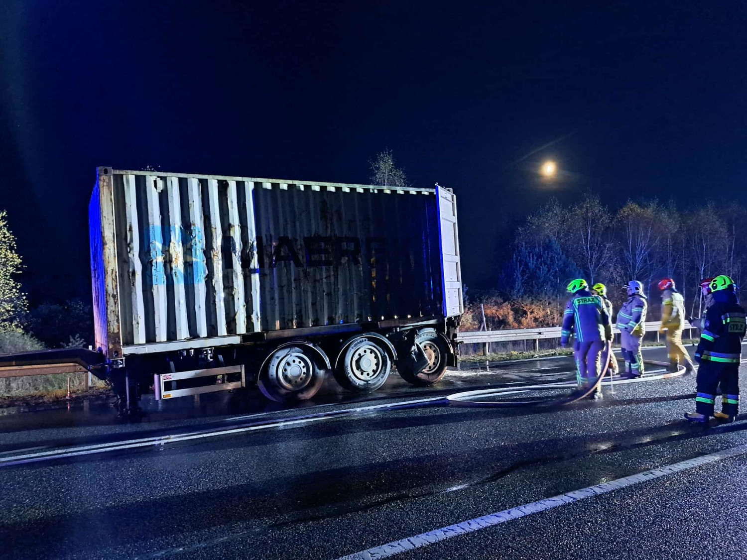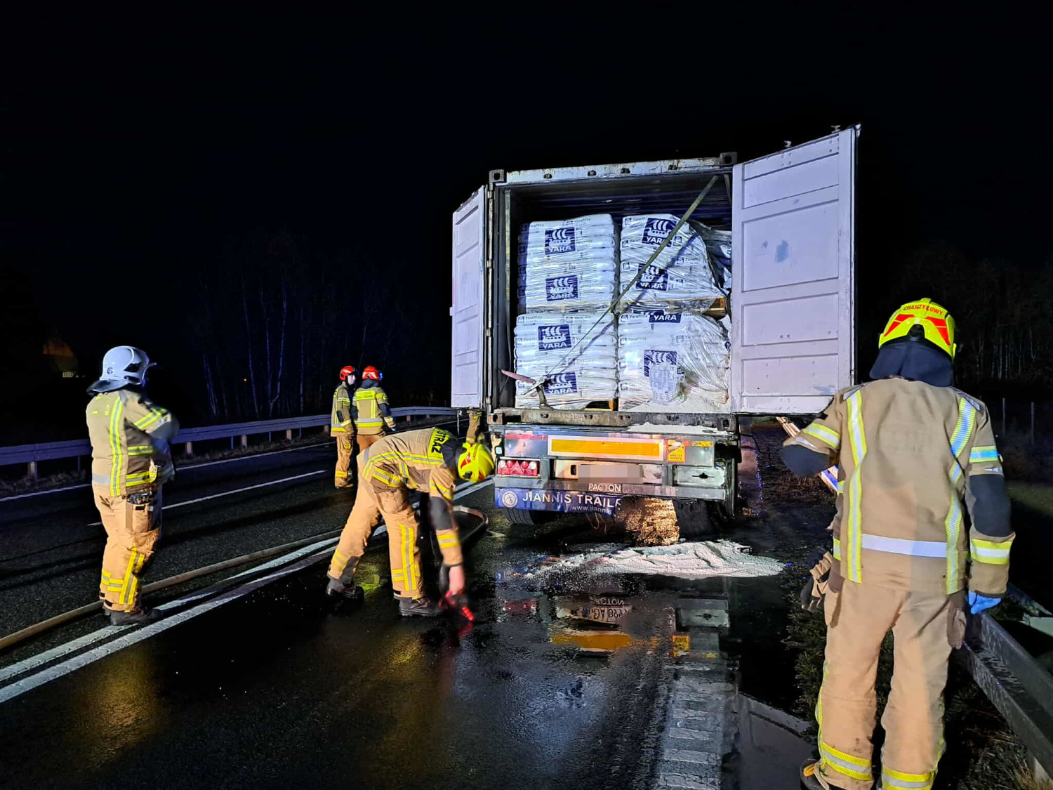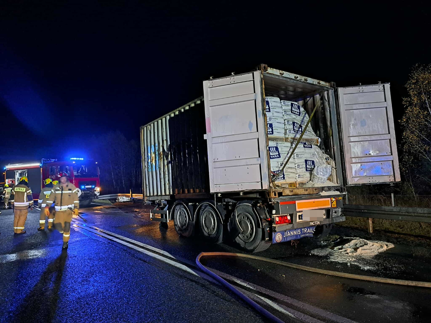 Po dojeździe na miejsce zdarzenia potwierdzono pożar naczepy, a właściwie jednej z opon tejże naczepy. Bezpośrednio nie doszło do zapalenia się nawozów sztucznych. Działania straży polegały na zabezpieczeniu miejsca zdarzenia, ustaleniu, jakie substancje w są przewożone na naczepie i że tak powiem, dozorowania miejsca i sprawdzenia, czy ten pożar nie będzie nam się rozprzestrzeniał. Do tego na szczęście nie doszło.