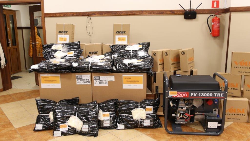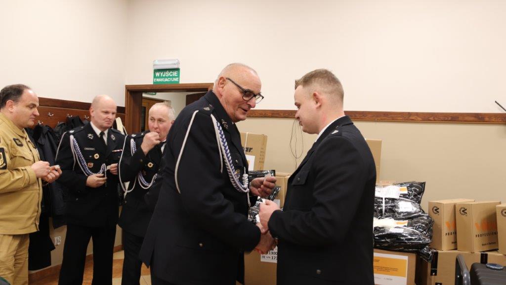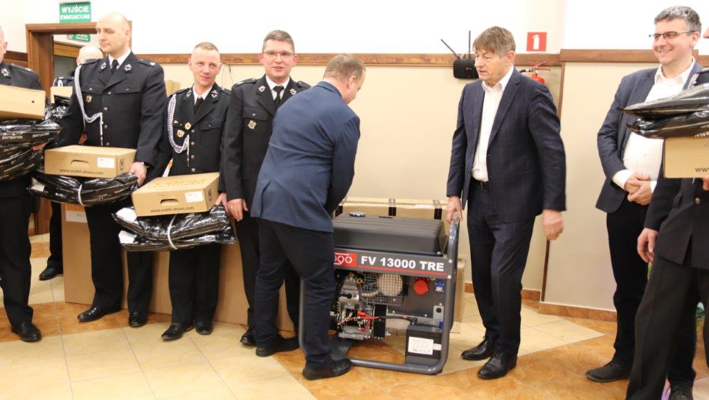 Przede wszystkim dużo zdrowia, spokoju, tyle powrotów co wyjazdów, bo to jest chyba najważniejsze dla strażaka, żeby było jak najmniej tych interwencji, a jak najwięcej ćwiczeń. Takiego pożytku dla ludzi, dla społeczeństwa i dzisiaj to jest namiastka tego sprzętu, który chcemy przekazać. To jest w ramach ochrony ludności. No tak jak tutaj widzimy będą to agregaty prądotwórcze. to są już ubrania bojowe. hełmy pożarnicze i obuwie strażackie.