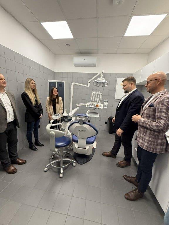 Tam powstała nowa hala sportowa i na etapie jej budowy jedno z pomieszczeń zagospodarowaliśmy tak, aby mógł właśnie ten gabinet tam powstać tutaj, przy udziale i determinacji dyrektora, który wszedł w kontakt z lekarzami stomatologiami. Oni pozyskali kontrakt z Narodowego Funduszu Zdrowia i właśnie jako jeden z nielicznych samorządów w województwie pomorskim mamy w naszej szkole gabinet stomatologiczny.