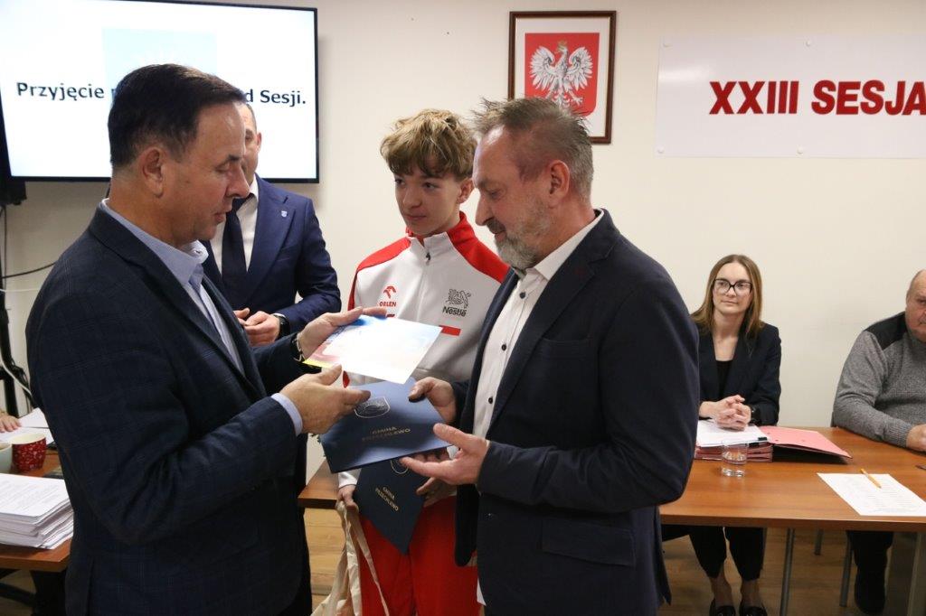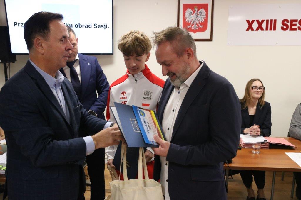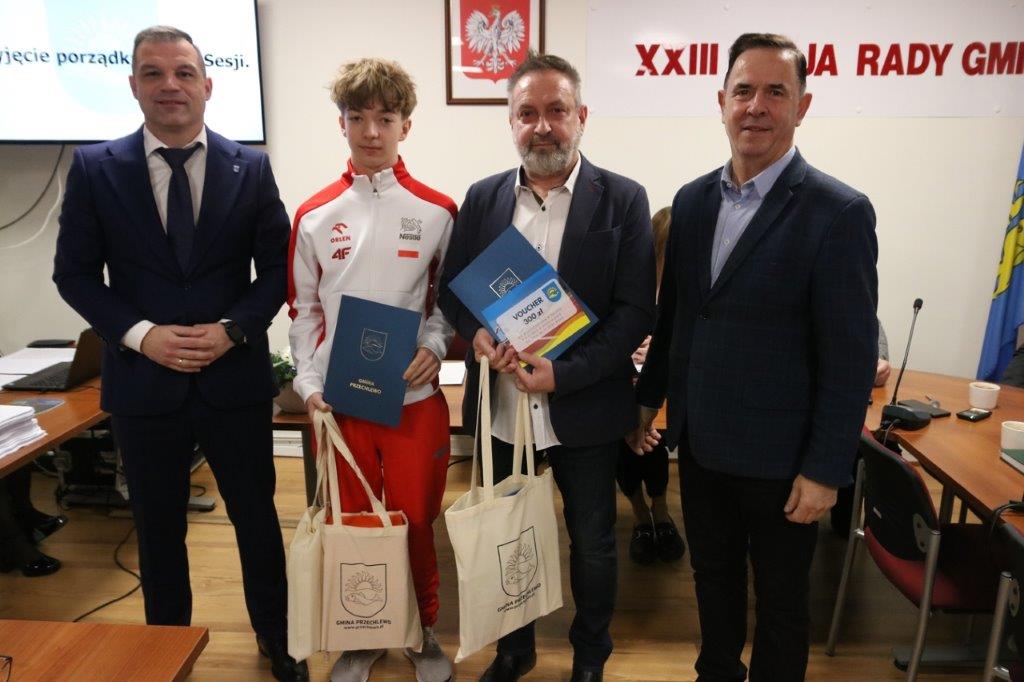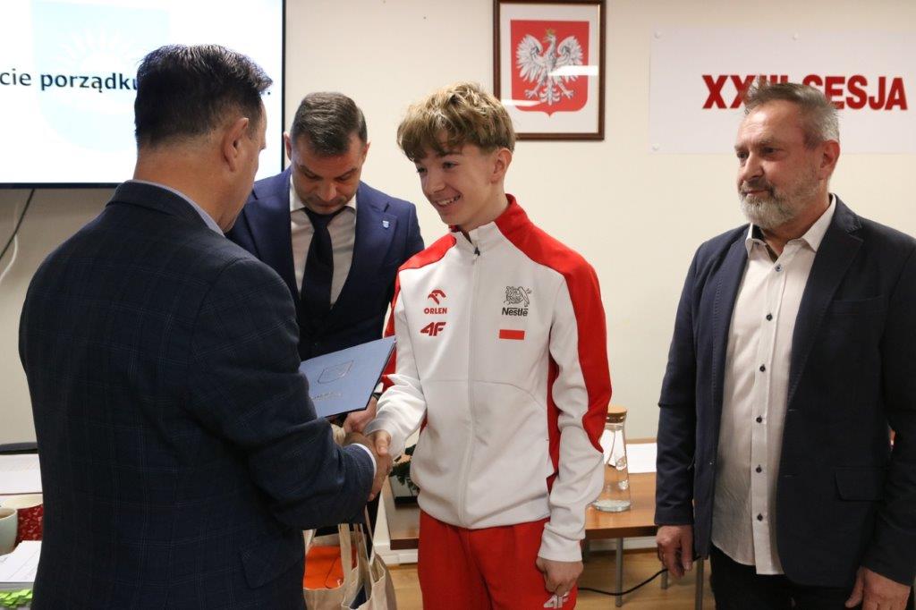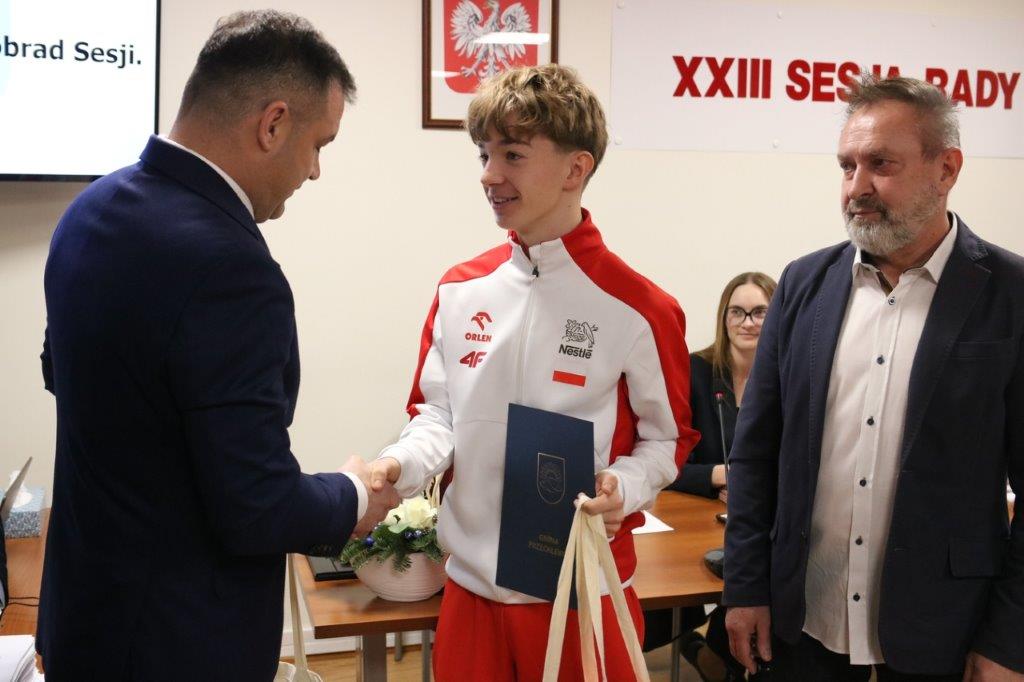 "W tym roku wygrał wszystko, co mógł wygrać w swojej kategorii" - tak przewodniczący Rady Gminy Przechlewo Tomasz Prus uzasadniał uhonorowanie Alexa Majera - lekkoatlety Brdy Przechlewo i ucznia przechlewskiej podstawówki. Wraz z wójtem nagrodzili 13-latka za liczne sukcesy. To m.in. wygranie ogólnopolskiego finału Czwartków Lekkoatletycznych, ustanowienie rekordu Polski U-14 w biegu na 200 m czy wygrana w meczu Polska - Słowacja - Austria.