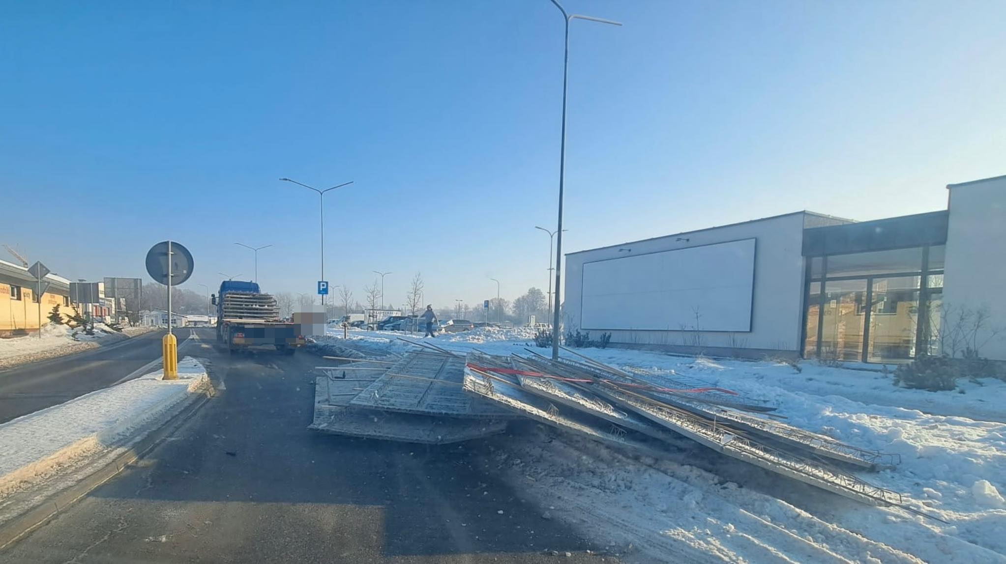 Utrudnienia na ulicy Dworcowej i Wolności w Bytowie. Na jezdnię spadły betonowe płyty